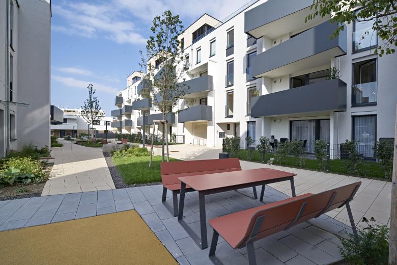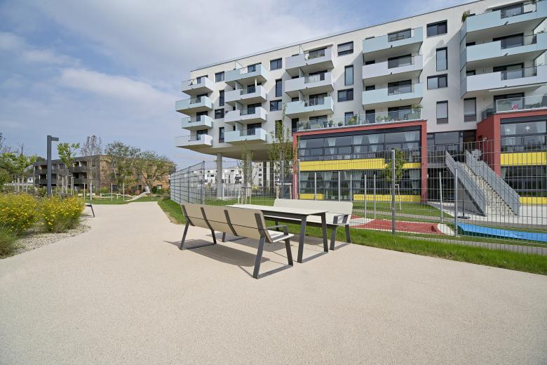 Auf Bauplatz 1 befindet sich ein Kleinkinderspielplatz im Erdgeschoß, der in Verlängerung des großen Gemeinschaftsraumes liegt. Dieser ist mit Spielsandfläche, Sitzbank und Mini-Kletterwand ausgestattet. Der Kleinkinderspielplatz verbindet den Gemeinschaftsraum direkt mit den siedlungsinternen Wegen. Entlang der öffentlichen Durchgänge befinden sich Gräserstreifen als wegbegleitende Pflanzung. Auf dem Dachgarten breitet sich eine Hügellandschaft aus, die durch Heister-Gruppen (Baumhasel, Zieräpfeln, Kupfer-Felsenbirne) gegliedert wird. Sie bieten BewohnerInnen genügend Schatten und Windschutz auf dem Dach.