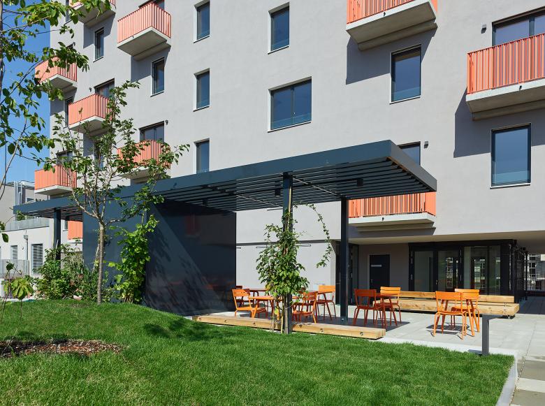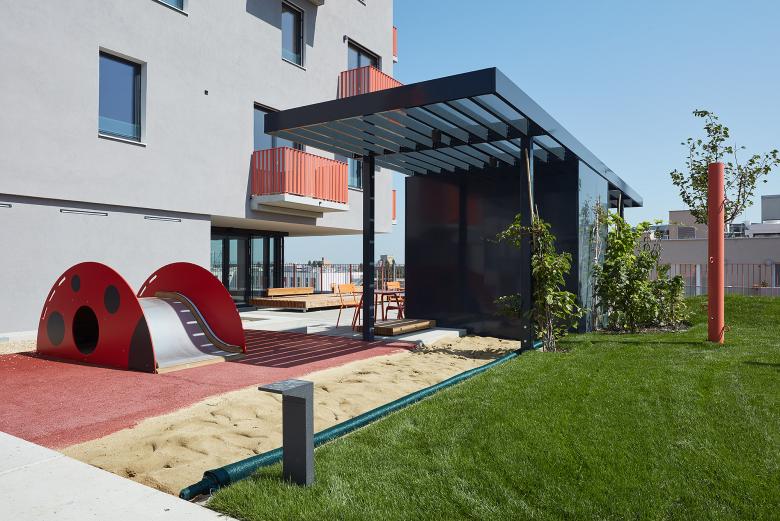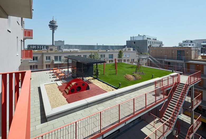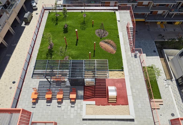 Angelehnt an die Streuobstwiesen ist der Dachgarten einfach gestaltet und bringt den Naturbezug direkt zu den BewohnerInnen. Hügelbeete und Kleinkinderspielplatz sind hier ebenso wie der bereits erwähnte Terrassenbereich positioniert.
