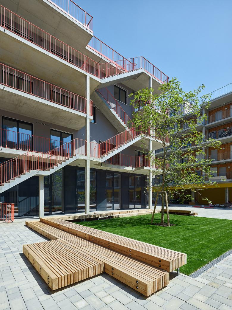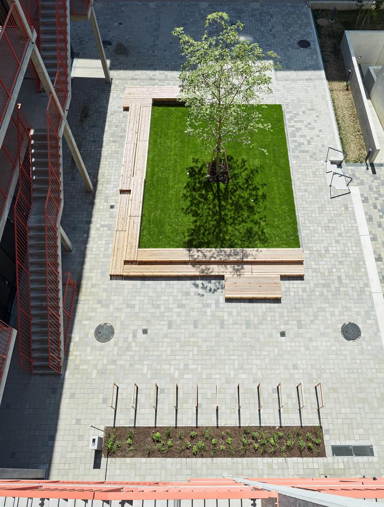 Unkomplizierte Kommunikation, Ruhe und Spiel sind unter dem Quartiersbaum möglich. Ein moderner Treffpunkt nach alten Gestaltungsprinzipen eines Dorfplatzes.