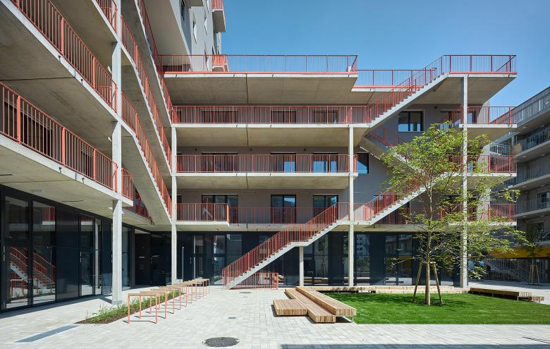 Das von der Promenade kommende Funktionsband mündet in den Platz am Park nahe der Stadtloggia. Die Stadtloggia liegt am Kreuzungspunkt der beiden wichtigsten Verbindunglinien des Quartiers. Dieser 5m hohe Raum kann vom Hausbetrieb abgekoppelt und zum Platz hin geöffnet werden und so mit dem öffentlichen Platz- und Arkadenraum temporär verschmelzen.
