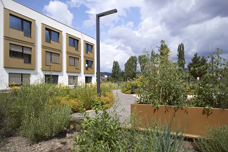 Als Referenz zu den berühmten Schwefelheilquellen dient ein Farbkonzept, das sich in Belägen und der Bepflanzung wiederfindet. Der Standort im Auenbereich der Schwechat wird durch standortgerechte Gehölzbepflanzung, Geländemodellierungen und fließende Ausgestaltung des Wegesystems berücksichtigt. Alle drei Themenschwerpunkte Wald, Schwefel und Wasser werden in den Innenhöfen aufgegriffen und abstrahiert.