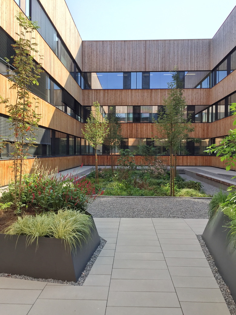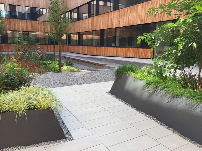 Der 34x16m große Freiraum des Atriums bedient sich dem Spiel von drei Höhenniveaus, welche durch anthrazit-graue Mauern betont werden. Dabei entstehen eine Terrasse mit hellen, großformatigen Betonsteinplatten, ein Parterre mit hellem Kies, sowie ein vertiefter Auszug eines Auenwäldchens. Die drei Ebenen formen eine Erzählung von Licht und Schatten, Kontrast und Konvergenz.