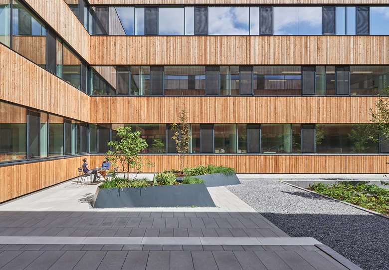 Im Parterre brechen grüne Fragmente in Form von bepflanzten Stahltrögen aus dem Boden heraus. Inspiriert von der warmen Lärchenholzfassade wurde eine Sitzauflage mit unterschiedlichen Lattenbreiten konzipiert.