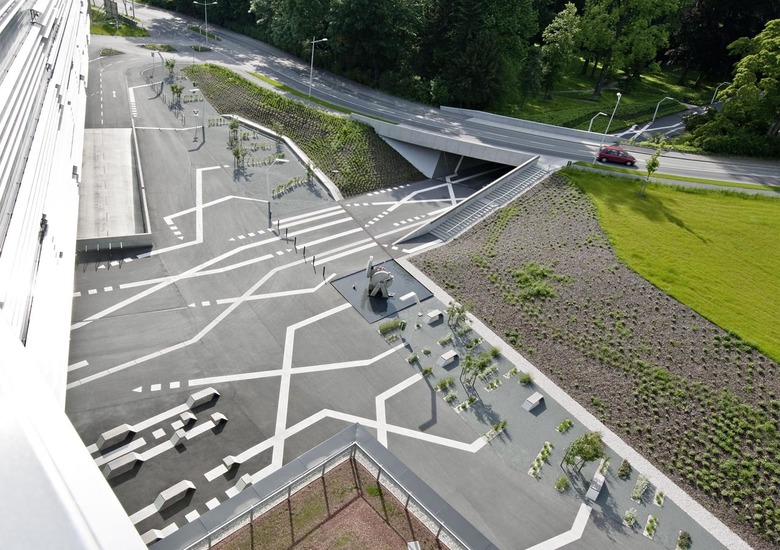Kennzeichnend für den Science Park Linz ist das enge Zusammenspiel zwischen Außen- und Innenraum und die Verbindung zwischen altem Unicampus und Neubau. Die Verbindung und Verzahnung von Außen-Innen und Alt-Neu entsteht durch ein dreidimensionales Liniensystem: „Raumlinien“ im Freiraum. Diese entwickelten sich aus dem mit Mechatronik assoziierten Kabelsalat und den Halbleiterplatten. Sie sind das Markenzeichen des Außenraumes zwischen der bestehenden Johannes-Kepler-Universität und den Neubauten. Die Unterbrechung der Linien und Pfeile markieren Zonen der Ent- und Beschleunigung. Die „Raumlinie“ bietet somit Information, ist verbindendes Element und dort, wo sie in den dreidimensionalen Raum erwächst, Ort der Kommunikation. Sie ist also nicht einfach eine weiße Bodenmarkierung. Sie wechselt in ihrer Materialität und Dimensionalität, behält jedoch ihre Farbe und wird zu eigens designten Möbeln und Beleuchtungskörpern, zu Pflanz- und Heckenstreifen mit z.B. weißblühenden Stauden, wiederholt sich als Sitzstufe im gesamten Außenraum, zieht sich als zweidimensionale Linie in das Gebäude, wo sie wiederum zu Möbeln, wie beispielsweise einer Bar erwächst. Dieses Konzept der Raumlinie wird konsequent über alle Höfe und auch den Parkplatz weitergeführt. Die Unterführung verbindet den Neubau auf kurzem, autofreiem Weg mit der bestehenden Universität. Bei der Planung der Unterführung, die in einem Bestandspark liegt, wurde besonderer Wert auf den sorgsamen Umgang mit dem alten Baumbestand gelegt.