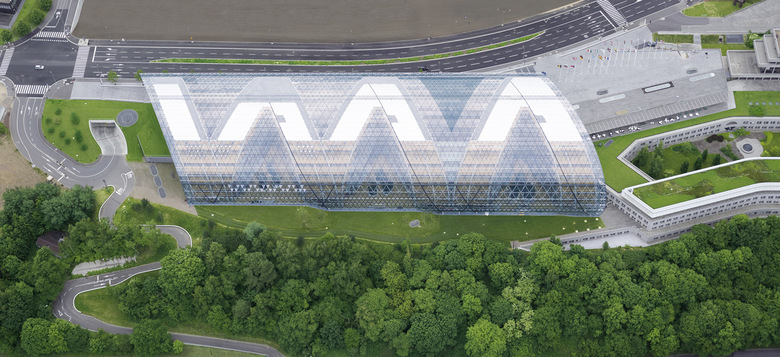 Eine leichte Glashülle überspannt die V-förmigen Bürotrakte, die durch Atrien und Wintergärten miteinander verbunden sind. Der Entwurf nimmt allseitig die vorhandenen Geländehöhen auf und fügt sich so in die Landschaft ein. Der Geländeverlauf wird im Inneren des Hauses fortgeführt, indem sowohl die Hallen als auch die Restaurants, Konferenzräume und öffentliche Nutzungen terrassiert sind.