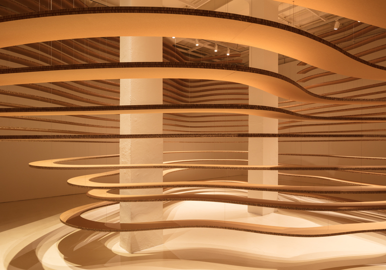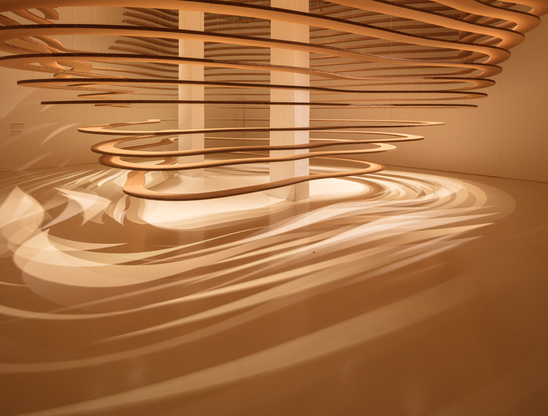 The organic shape of the building complex with its iconic louvres, and the generous planting, contribute to an improvement of the microclimate and increase biodiversity. Inspired by Asian paddy field terraces, the green center formed by the four towers—with its multi-story three-dimensional gardens—reflects the diversity of tropical flora and creates a new habitat. The compact and efficient layout design is complemented by energy-saving ventilation systems, highly effective external solar screening devices, and glazing that reduces solar radiation into the building. A space-filling sculpture is the central exhibit in the Aedes Architectural Forum; it models the deliberate design of the building shape so that it can be fully appreciated. A documentary film of the building by architectural photographer HG Esch, interviews with project participants, and explanatory diagrams of the project provide visitors with new ideas for architecture in mega-cities.