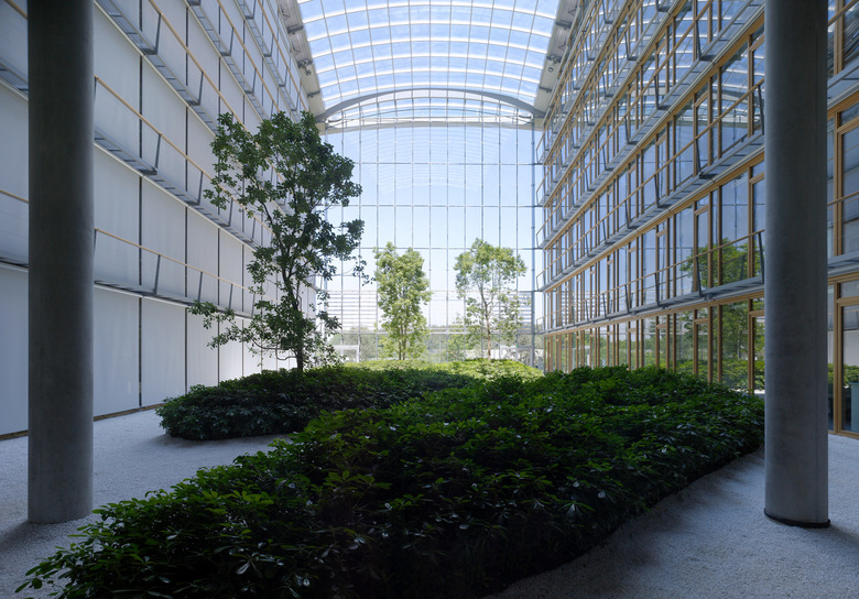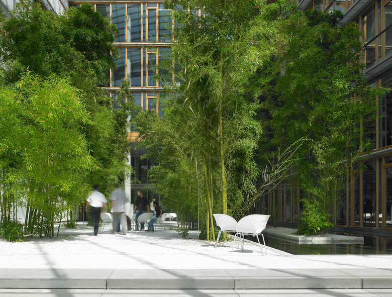 Die fünf- oder sechsgeschossigen Büroflügel bilden eine zentrale „Straße“, auf der Mitarbeiter sich ungezwungen treffen können. Die Bepflanzung der Gärten wurden aus fünf Kontinenten kuratiert und symbolisiert die globale Vernetzung der Lufthansa. Alle Gartenanlagen sind frei zugänglich und können als Pausenbereich zur Erholung oder für kleinere Besprechungen genutzt werden. Außerdem dienen sie als Wärmepuffer, verbessern Mikroklima und Schallschutz. Alle Büroräume sind zu den Wintergärten hin orientiert, die ausschließlich über die benachbarten Büros beheizt werden. Das ökologische Gebäudekonzept fördert eine gesunde Arbeitsumgebung. Holzfenster und Holzböden schaffen eine warme Atmosphäre. Die flexible Bürostruktur schafft durch hohe Reversibilität und hierarchiefreie Arbeitsplätze inspirierendere und teamorientiertere Arbeitsbedingungen, die offene Architektur begünstigt spontane Interaktionen. Jeder Mitarbeiter kann seine eigenen Fenster einzeln öffnen und schließen und einen kleinen inneren Balkon benutzen. Klimatische Fehlentscheidungen werden dabei von einer ausgeklügelten Steuerungslogik gekontert. Durch den Verzicht auf abgehängte Decken dient die Betonkonstruktion als thermisch aktivierte Decke. Mitten in einem der effizientesten Verkehrsknotenpunkte Europas besticht die neue Lufthansa-Zentrale mit Einfachheit, Klarheit und Einzigartigkeit.