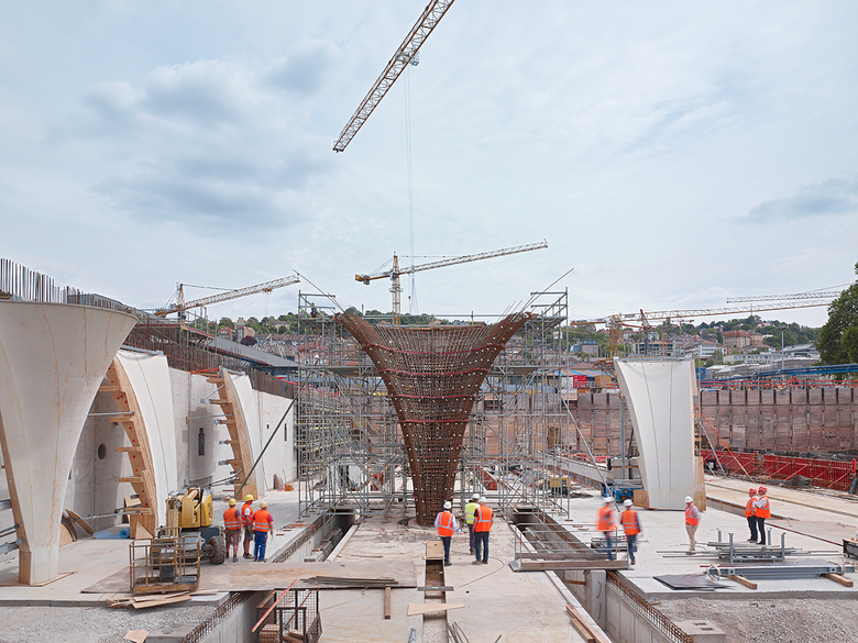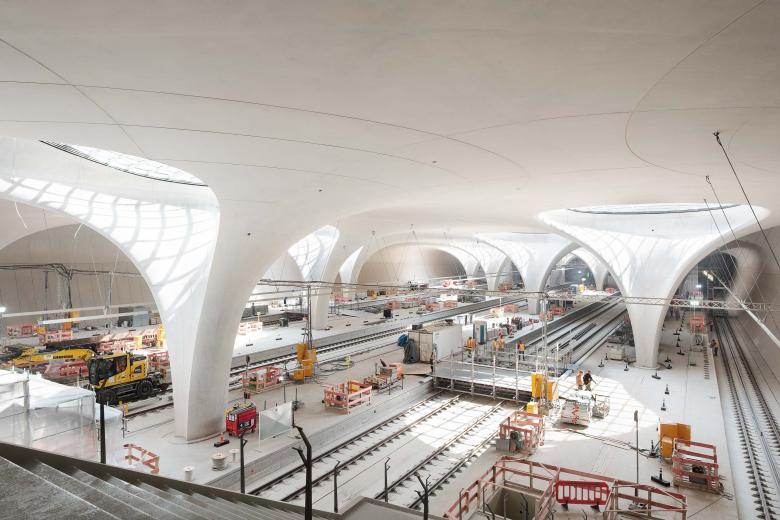 Der von ingenhoven architects entworfene neue unterirdische Bahnhof besticht insbesondere mit Helligkeit und einer visuellen Offenheit, die Ästhetik und Sicherheitsvorteile verbindet. Der neue Bahnhof besitzt eine rein auf Druck belastete, weiße Betonstruktur mit minimaler Aufbauhöhe. Die Stärke der optimierten Schalenstruktur wurde auf ein Hundertstel der Spannweite reduziert, was einen erheblich geringeren Materialeinsatz ergibt. Wiederverwendbare Betonschalungen und modulare Fertigteile erhöhen die Effizienz der Bauarbeiten. Ein eigens entwickelter Spezialbeton macht die architektonische Struktur durch Sichtbetonflächen, die ohne Brandschutzverkleidung auskommen, offen erkennbar.