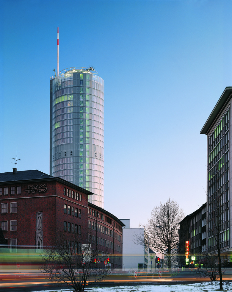 Das 127 Meter hohe Hochhaus ist das erste ökologisch orientierte Gebäude mit einer zweischaligen Ganzglasfassade zur natürlichen Ventilation der Büroflächen. Das Gebäude gilt als erstes umweltfreundliches Hochhaus in Deutschland. Das RWE-Hochhaus steht frei hinter einem arrondierten Blockrand. Durch die punktförmige Verdichtung konnte der Blockinnenbereich zugunsten eines großzügigen Parks freigehalten werden. Über eine vorgelagerte öffentliche Plaza wird das Hochhaus erschlossen. Die Tageslichtausbeute und die natürliche Ventilation werden über ein neu entwickeltes Element, das so genannte “Fischmaul”, mit Sonnen- und Blendschutz, Be- und Entlüftungsfunktionen, optimiert. Über ein Steuerungstableau können alle Raumfunktionen den individuellen Anforderungen angepasst werden.