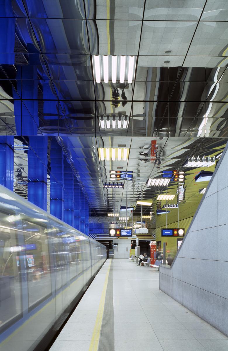 Bei der Renovierung des U-Bahnhofs „Münchner Freiheit“ wurden in erster Linie vorhandene Elemente und Flächen neu in Szene gesetzt. Die blau gekachelten Pfeiler sind ein wesentliches Element der ursprünglichen Gestaltung, das sowohl das Baureferat als auch Ingo Maurer erhalten und betonen wollten. Neue, in der Decke eingelassene blaue LED-Strahler beleuchten die Pfeiler, wodurch der Farbton intensiver wird. Sie scheinen nun von innen heraus zu leuchten. Auf der Bahnsteigebene, die sich in zwei Bereiche mit unterschiedlicher Deckenhöhe gliedert, sind die kürzeren Pfeiler wie im Sperrengeschoss vollkommen angestrahlt, während sich an den hohen Pfeilern ein Farbverlauf von oben nach unten ergibt. Das Konzept für die Decke, die in allen Bereichen des U-Bahnhofes mit hochglanzpolierten Edelstahlblechen verkleidet ist, stammt vom Baureferat München. Die Verspiegelung erhöht die Raumhöhe und verdoppelt optisch die Höhe der blau leuchtenden Pfeiler. Im relativ niedrigen Sperrengeschoss wird so der unangenehme ‚Unterführungscharakter‘ der Gänge beseitigt. „Die großflächig verspiegelte Decke verleiht dem Bahnhof ein spielerisches Element. Auf dem Weg zum Bahnsteig oder beim Warten können die Fahrgäste die Reflexionen an der Decke betrachten, die natürlich etwas verzerrt sind. Man sieht andere Menschen, die Räumlichkeiten, einfahrende U-Bahnen, alles von oben.“, sagt Ingo Maurer. An die großflächigen Bahnsteigwände wurden horizontal gekantete Bleche angebracht, die mit einem kräftigen Leuchtgelb beschichtet wurden. Die hellgelbe Farbe der Verkleidung bildet einen Komplementärkontrast zum Blau der Pfeiler und prägt das neue Erscheinungsbild des U-Bahnhofes entscheidend mit. „Ich empfinde die Kombination von Komplementärfarben, also einen starken Kontrast, als sehr anregend. Daher haben wir uns für das Leuchtgelb entschieden. Ich hoffe, dass die Menschen sich von der Kraft und der Frische anstecken lassen, und die Nutzung der U-Bahnstation als einen Moment erleben, vielleicht auch ganz unbewusst, der ihren ‚Spirit’ und ihre Stimmung hebt.“, so Ingo Maurer. Quadratische Lichtkassetten, die mit Leuchtstoffröhren ausgestattet sind, ragen im spitzen Winkel aus der Decke. Ihre Innenseiten sind ebenfalls gelb, blau oder silber beschichtet und nehmen mit diesem relativ unscheinbaren Detail die farbliche Thematik auf. In den Bereichen des U-Bahnhofes mit niedriger Deckenhöhe wurden nur silberbeschichtete Lichtkassetten eingesetzt, um eine allzu große Unruhe der Gestaltung zu vermeiden. Ingo Maurer und sein Team verteilte sie frei an der Decke, um den statischen Eindruck der Bahnsteighalle aufzulockern. Zusätzlich wurde sie in verschiedene Richtungen geneigt, um überall auf der Bahnsteigebene die geforderte Mindesthelligkeit zu erreichen. Die leuchtgelben Wände, die blau leuchtenden Pfeiler und die verspiegelte Decke sind die entscheidenden Elemente, mit denen das Erscheinungsbild des U-Bahnhofes einer deutlichen Wandlung unterzogen wurde. Durch die farbliche Gestaltung und die Auswahl des Oberflächenmaterials wurde das Ziel, den ‚angegrauten‘ Bahnhof in einen modernen, anregenden Raum zu verwandeln, erreicht. Der Bahnhof „Münchner Freiheit“ ist nach „Westfriedhof“ und „Am Moosfeld“ die dritte Station in München, mit deren Gestaltung Ingo Maurer von der Stadt München beauftragt wurde. Das Münchner Baureferat hatte die Projektleitung für die Gesamtkonzeption der Modernisierung und die Ausführungsplanung des Innenausbaus. „Meine Absicht war es, einen modernen, zeitgenössischen Raum zu schaffen, in dem man sich mit dem städtebaulichen „Jetzt“ anderer Städte und Länder verbunden fühlt. Ich denke, das haben wir erreicht. Es war uns eine Freude, diesen öffentlichen Raum ganz in der Nähe der Kaiserstraße zu gestalten, wo wir seit fast 40 Jahren unsere Büros haben, und seit Februar 2009 auch unseren einzigen Showroom in Europa.“, sagte Ingo Maurer abschließend.