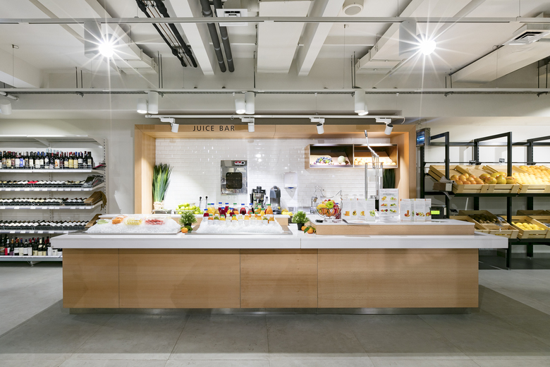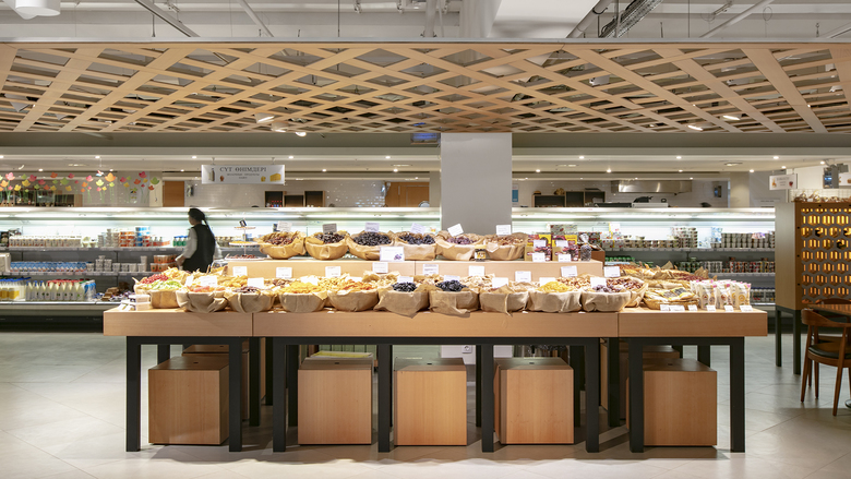 Wood, white ceramic tiles and stone are the main materials employed to exhibit the colorful array of products in a clean, minimalistic way, with interesting details like latticed woodwork in the ceiling. Spaciousness is another key feature of the supermarket, and an industrial feel has been applied by exposing pipes and ventilation units. The space is comprehensively divided into different sections which lack of physical divisions to make the shopping experience a practical and most importantly, a pleasurable one.