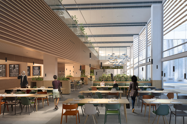 The program includes the interior design of the main entrance, lounge, reception, lift lobbies and corridors, food courts, restaurants, prayer rooms, staff clinic, gym, indoor games, VIP lounge, meeting rooms, offices, government center, employee center, library, training center with classrooms, administration and public toilets. The concept for the design of the headquarters takes inspiration from the country’s natural surroundings and geology; the desert life and the continuous search for the oasis as a way of finding a breathing space from the harshness of the environment. This metaphor is reinterpreted through the beauty of the dunes by replicating the natural colors of sand and pastel blue tones.