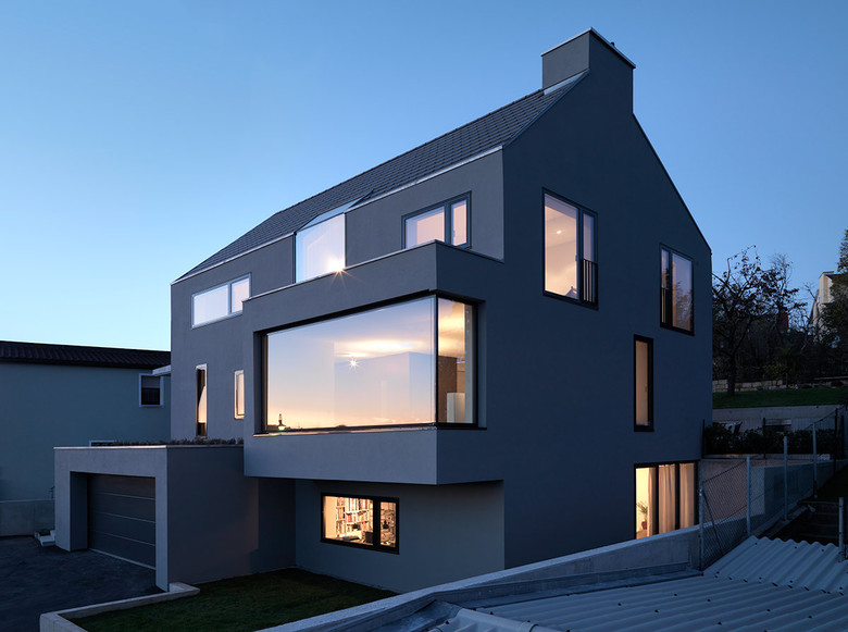 Insgesamt lebt das Haus von seinem Außenbezug. Entwickelt wurde ein monolithischer Baukörper, der das Haus mit seinen verschiedenen Elementen wie aus einem Guss erscheinen lässt. Diese Einheitlichkeit wird durch den gleichen grauen Farbton unterstrichen, der sich in den Dachziegeln wie der glatt verputzten Fassade wiederfindet. Mit dem Giebeldach sowie den Trauf- und Firsthöhen wird Bezug zur Nachbarbebauung aufgenommen, von der sich der Bau auch durch die Anordnung der einzelnen Elemente, die ihm sein unverwechselbares Äußeres verleihen, visuell absetzt. Der Dachfirst ist asymmetrisch angelegt und wird in seiner Wirkung durch den überproportional ausgeführten Schornstein noch verstärkt. Aufgebrochene Strukturprinzipien charakterisieren auch die Fassadengestaltung: Die Fenster in den einzelnen Geschossen sind in unterschiedlichen Höhen, Breiten und Formen ausgeführt. Durch vorspringende oder zurückgesetzte Gebäudeteile wie den Glasvorbau, die Garage oder den Eingangsbereich wird das Haus zusätzlich rhythmisiert, sodass der Bau aus jeder Perspektive ein überraschendes neues Gesicht erhält.