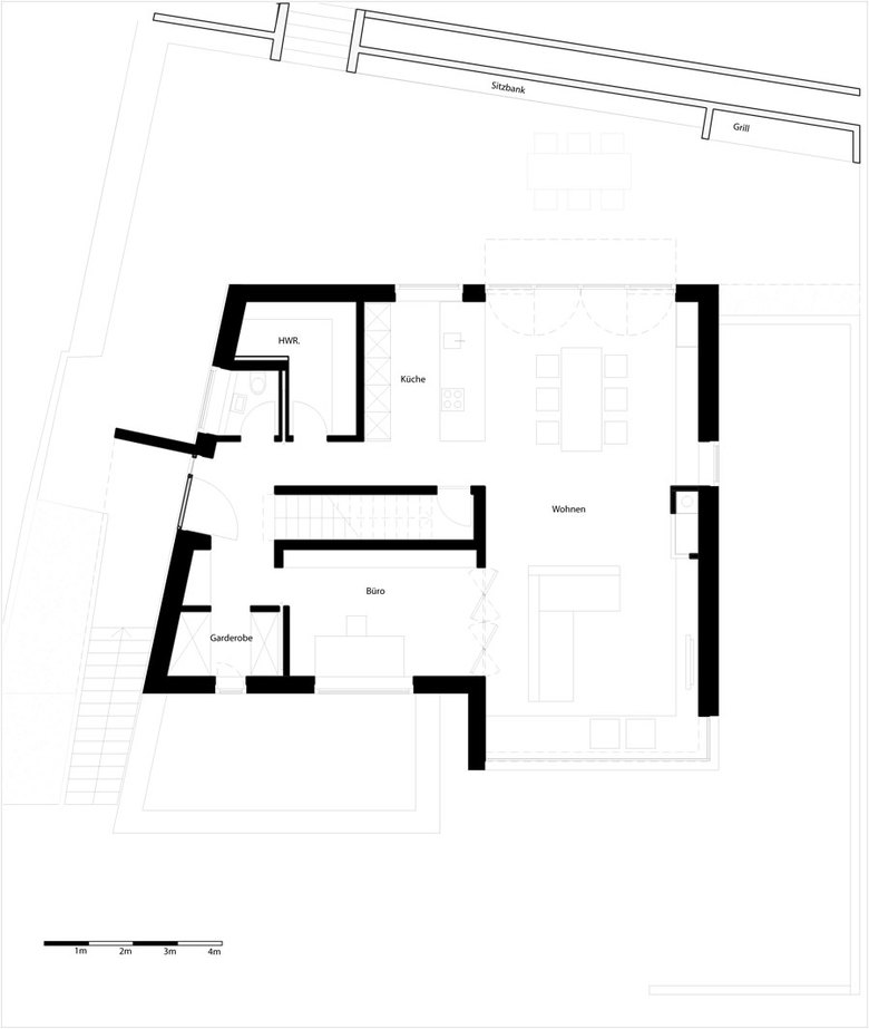 Das Haus erstreckt sich über drei Ebenen. Die untere Wohnebene mit Büro, Gästezimmer und -bad, Garage und Abstellräumen befindet sich auf Straßenniveau und wurde sie als klimatischer Puffer ausgeführt. An einer Seite wurde ein Lichthof in den Hang gegraben. Dadurch kann ein Großteil der Räume im Untergeschoss außerdem mit Tageslicht versorgt werden und die windgeschützte kleine Terrasse, die man über das Büro erreicht, schafft ein zusätzliches Angebot für Entspannung an der frischen Luft.