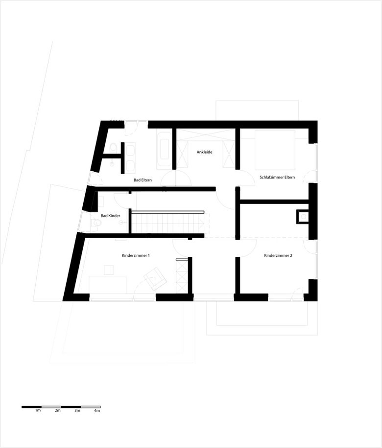 Grundidee für das zentrale Wohngeschoss war es, einen loftartigen Raum zu kreieren, wie ihn die Auftraggeber von ihrer bisherigen Stuttgarter Stadtwohnung gewöhnt waren. Küche, Wohn- und Essbereich sowie eine Bibliothek organisieren sich als offene Einheit um den Treppenhauskern. Die ganz in weiß gehaltene Küche separiert sich lediglich durch den freistehenden Tresen vom Essbereich. Dieser ist das kommunikative und soziale Zentrum der Wohnung – und ein lichtdurchfluteter Ort. Über eine große Fensterfront mit Tür kann man dieses an warmen Tagen zur Terrasse hin erweitern. Tageslicht aus Richtung Süden verbunden mit einer großartigen Aussicht auf den Ort erreicht den Esstisch auch über ein L-förmiges Panoramafenster im sich anschließenden Wohnbereich. Dessen Glasvorbau verleiht der Wohnebene die gewünschte Großzügigkeit und ist zudem ein Platz für Romantiker: Auf einer beheizten Fensterbank aus Sichtbeton kann man stundenlang beim Blick in die Ferne die Seele baumeln lassen. Für Behaglichkeit sorgt außerdem der in einen Wandvorsprung eingelassene Kamin. Der eingestellte, offene Treppenkern verknüpft die drei Ebenen des Hauses miteinander. Seine verschiedenfarbigen Wandflächen stehen im spannungsvollen Kontrast zum sonst im gesamten Haus dominierenden Weiß. Eine besondere Inszenierung erfährt dabei der Weg hinauf in den Privatbereich im Obergeschoss, der vom Tageslichteinfall am Ende der Treppe begleitet wird. Drei langgezogene Lampen-Zylinder verleihen dem Treppenschacht zusätzliche Höhe. Oben angekommen öffnet sich dann unter dem in die Dachfläche abknickenden Fenster ein aussichtsreicher Spiel- und Leseplatz. Die im Obergeschoss untergebrachten Räume – darunter zwei Kinder- sowie das Schlafzimmer – erstrecken sich bis unter das Dach, wodurch sie sehr großzügig wirken.