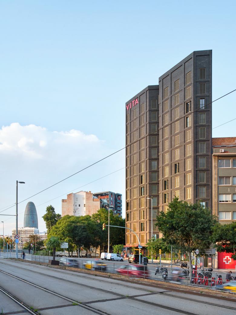 The residence defines the entrance to the 22@ District through Sancho de Ávila, marking the contact with the Meridiana Avenue and the relationship with Glorias Square with a bevelled tower and the Sancho de Ávila façade with a six-storey body. The 13 floors of the tower cantilever over the tunnels of the metro line 1 located under the plot, by means of large diagonal beams, which start from the subsoil up to the first floor, generating a flight over the chamfered corner. Along the Sancho de Ávila façade, the volume is fitted with a large porch and a height typical of the Eixample, defining the contact with the railway tunnel and the future school to be located on the Pamplona street. In its contact with the Zamora street, the building opens up a system of ribbed buttresses to provide views of the street and the school playground.