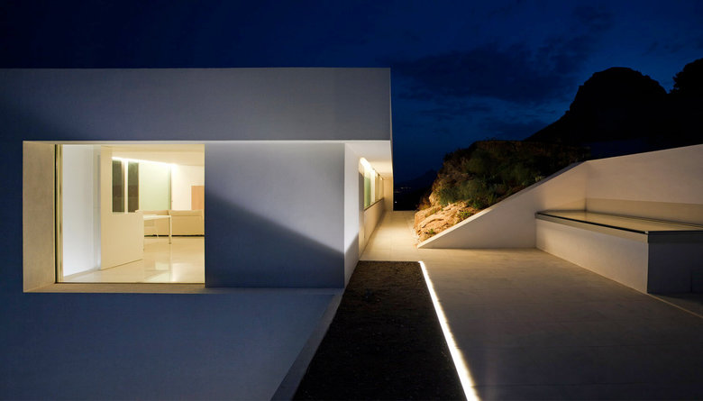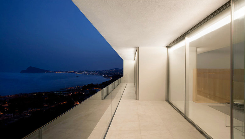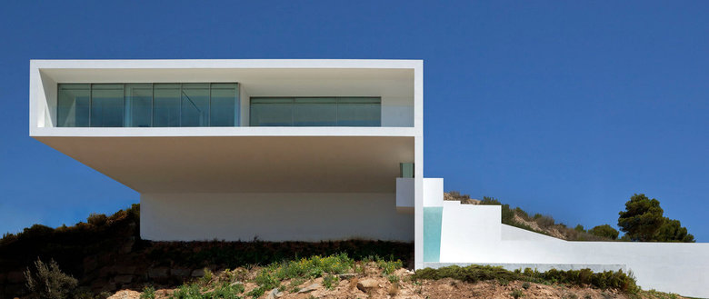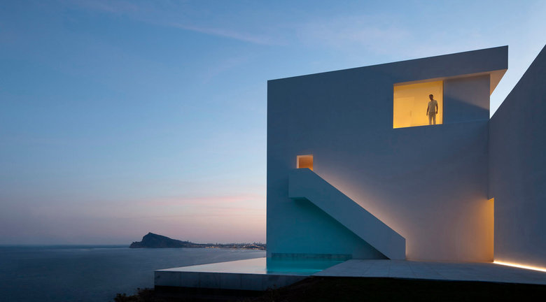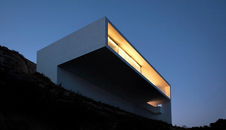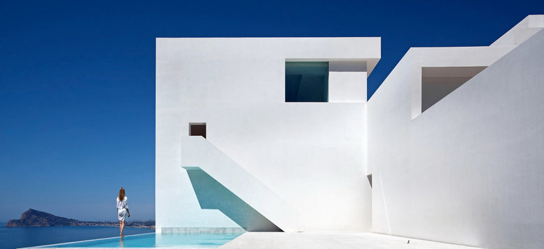 Premiada internacionalmente, la Casa del acantilado del arquitecto Fran Silvestre es una pieza blanca y vibrante aferrada a las rocas de un paisaje lunar. Parece a punto de alzar el vuelo hacia la inmensidad del Mediterráneo más disperso. El paisaje es el del término municipal de Toix Mascarat, en la alicantina Calpe. Está conformado por una abrupta pendiente a orillas del Mediterráneo que, además de unas vistas magnificentes, rebosa de la pétrea solidez en la que se asienta la estructura de losas de hormigón armado que configuran las líneas del edificio: una muestra extrema de minimalismo.