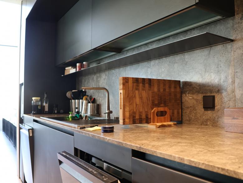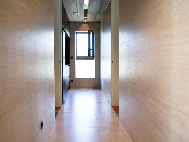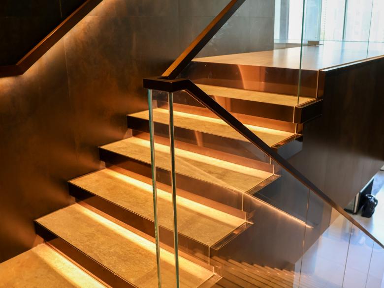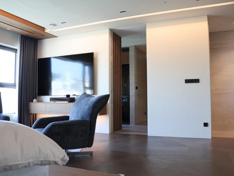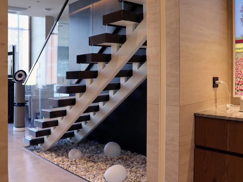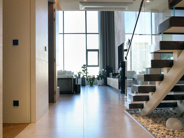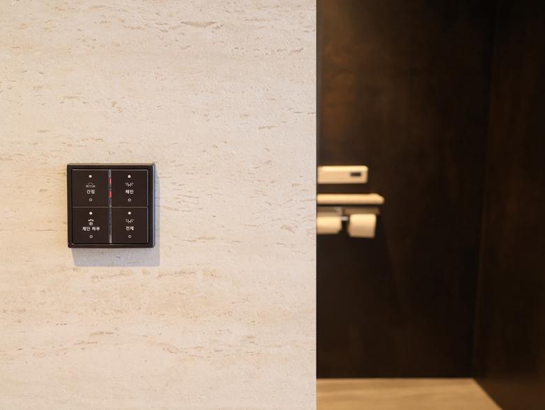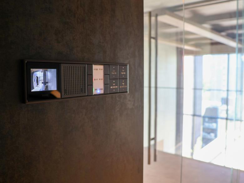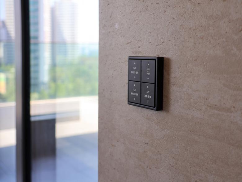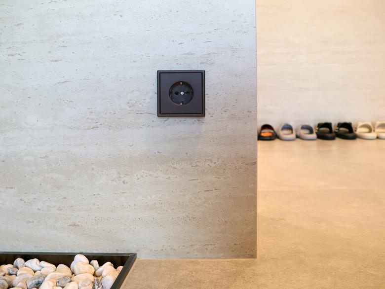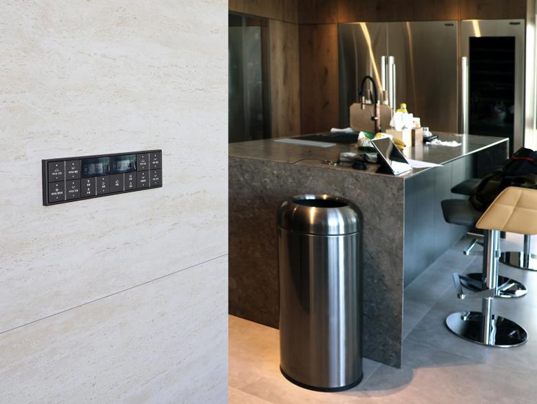 Auf allen drei Etagen der Wohnung ist der Designklassiker LS 990 in der Farbe Aluminium dunkel installiert - teils konventionell, teils als KNX-Taster. Die Optik und Haptik der gewählten Materialität unterstützt die gewünschte Modernität und Eleganz der Innenarchitektur bzw. bildet den gewünschten Kontrapunkt zu den Holz- und Marmorflächen. Das installierte KNX-System schafft ein intelligentes Zuhause. Mit Smart Visu Servern, Tastsensoren der Serie F 40, Raumreglern und Präsenzmeldern können verschiedene Funktionen wie Beleuchtungs-/ Dimmersteuerungen, HLK-Systeme und Fußbodenheizungssteuerungen manuell oder automatisch bedient werden. Darüber hinaus ermöglicht die installierte JUNG Innensprechanlage eine reibungslose Kommunikation und Zutritt mit Besuchern.