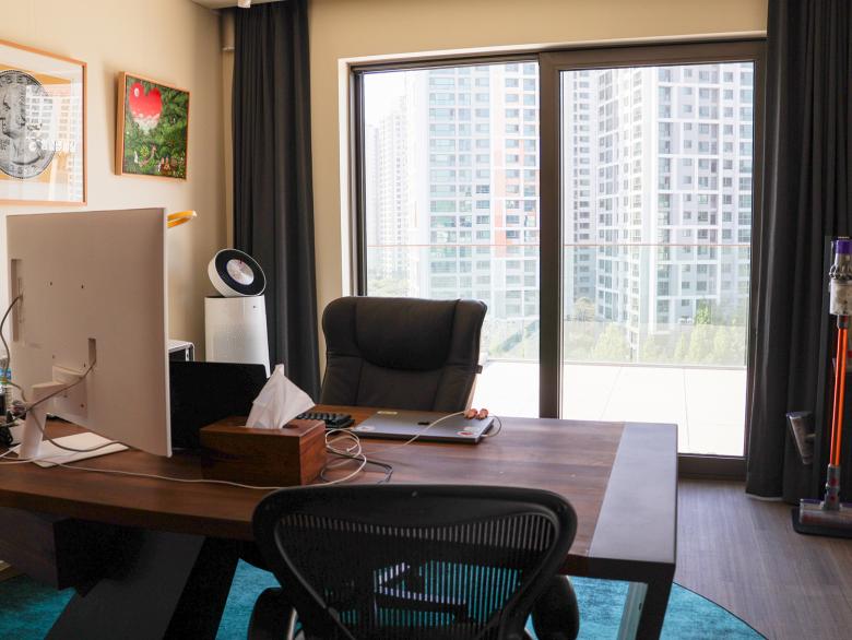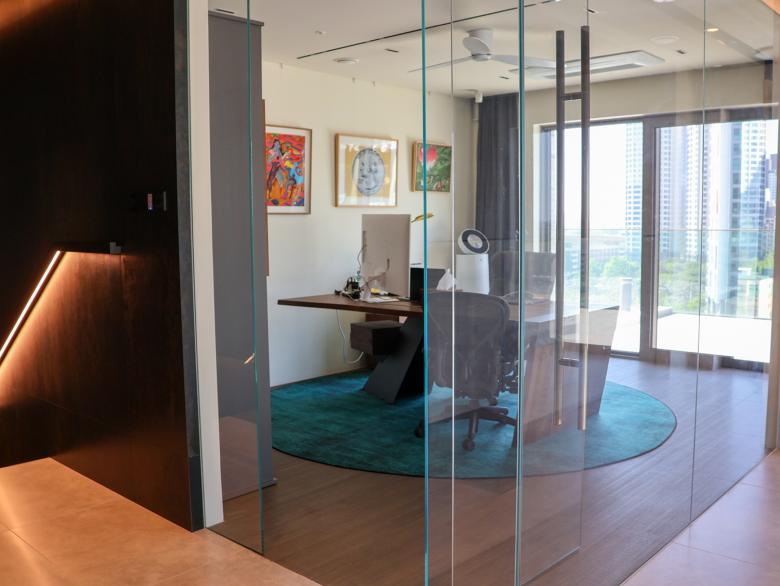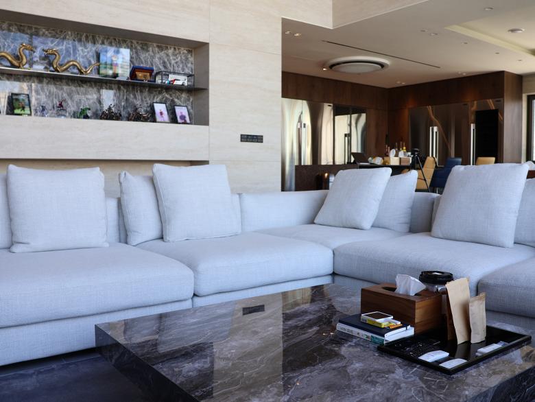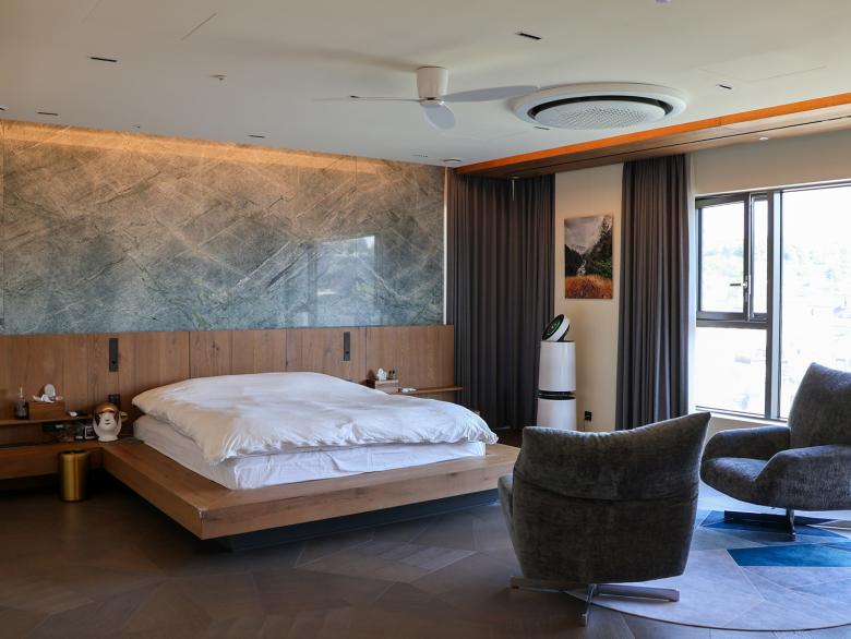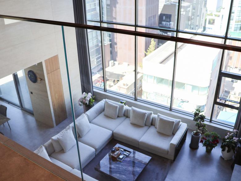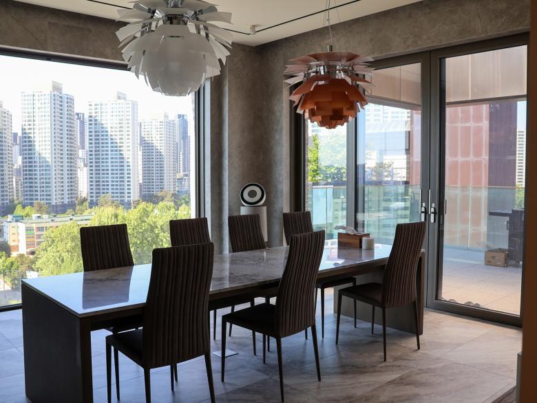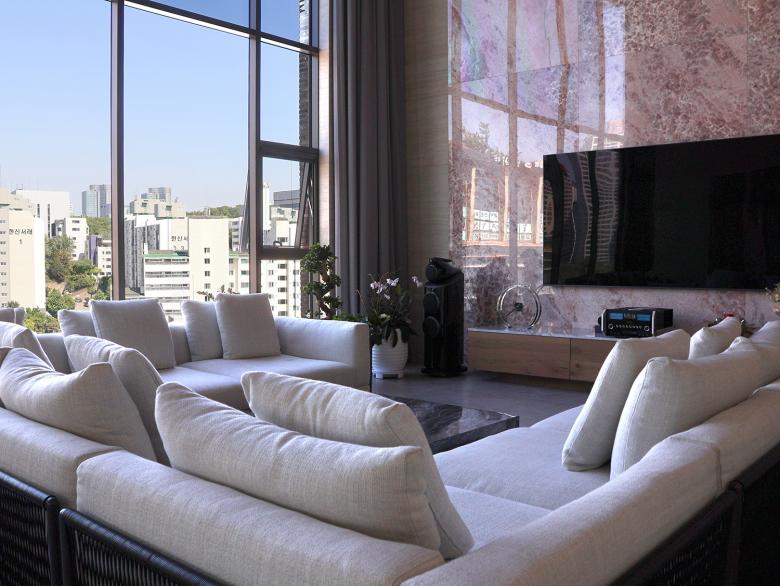 Im Herzen von Seorae Village befindet sich auch das neunstöckige „Seorae Square Building“, ein gemischt genutztes Gebäude, das in den unteren Stockwerken medizinische Einrichtungen und in den oberen Stockwerken großzügige Privatwohnungen beherbergt. Der Umbau, der von dem renommierten Innenarchitekturbüro Kulturwerte durchgeführt wurde, folgt deren Konzept einer „Kulturrevolution“, bei der die Kunden durch neue Ideen und Ansätze für alle Gestaltungs-elemente eines Raumes begleitet werden. So finden sich die hellen Ziegelwände, die das Seorae Square Building von außen zieren, auch in den Innenräumen wieder. Großformatige Natursteinplatten dienen im Inneren als Hintergrund und sorgen für eine moderne und freundliche Atmosphäre. Dunkle Holzelemente werden für Eingangstüren, Wände und Treppen verwendet, um dem Raum mehr Gewicht zu verleihen. Die mehrgeschossigen Innenräume in den Wohnbereichen sind durch offene Treppen und Lufträume mit filigranen Glasbrüstungen miteinander verbunden. In den öffentlichen Bereichen wie der Lounge schaffen weiße Möbel in Kombination mit hellem Marmor eine offene Atmosphäre. Die Verwendung von Marmor führt zu eleganten Mustern, die in Tische und Wandpaneele eingelassen sind und einen dekorativen Effekt erzeugen. In den privaten Bereichen wie Bädern und Arbeitszimmern wird dagegen eine Farbpalette aus robusten und edlen dunklen Materialien für Beleuchtung und Wandverkleidungen verwendet, um eine moderne und dennoch ruhige Atmosphäre zu unterstreichen. Im Küchenbereich stehen dunkle Holzregale und Küchenmöbel neben weißen Marmorböden und Wandverkleidungen und schaffen so ein harmonisches Gleichgewicht. Um den künstlerischen Vorlieben des Bauherrn gerecht zu werden, schmücken verschiedene abstrakte Kunstwerke die Schlaf- und Arbeitszimmer und verleihen den Räumen eine besondere Note.