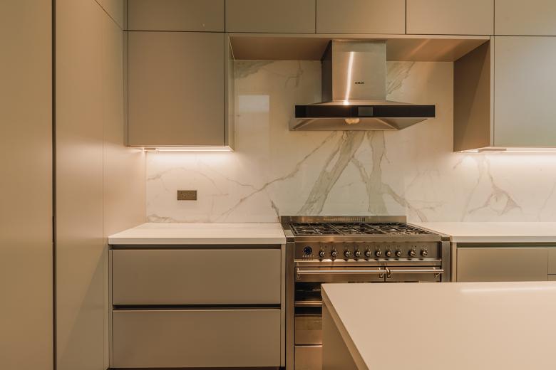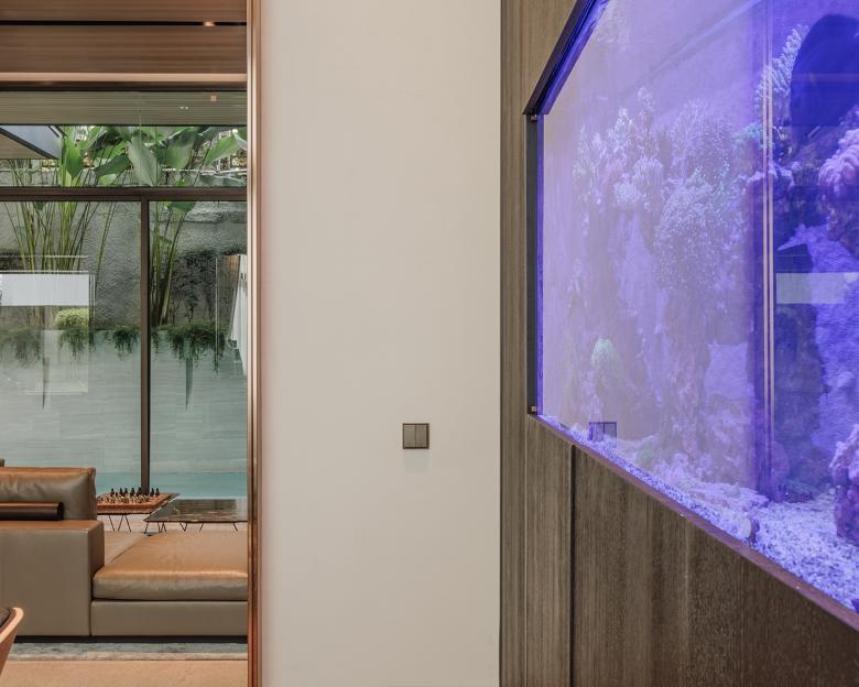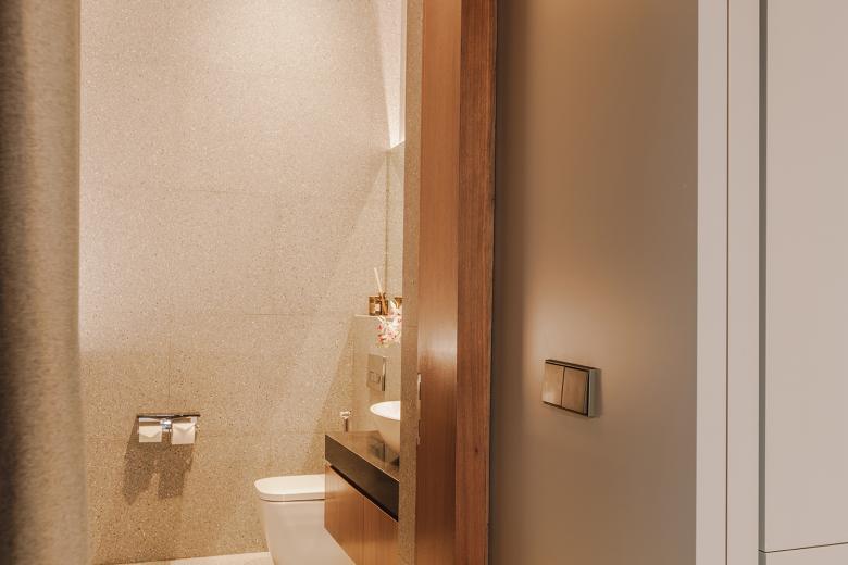 Großflächige Fenster an den Seiten des Hauses holen das Grün der Außenanlage visuell in den Innenraum. Das Spiel von Licht, Schatten und Reflexion betont die ruhige Materialität. Stein, Holz und Metalloberflächen fügen sich zu einer natürlichen Palette zusammen. Farblich dominieren helle, warme Töne wie Creme, Offwhite und helle Brauntöne. Der Materialeinsatz ist präzise abgestimmt und jede Oberfläche übernimmt eine klare Funktion im Raumgefüge.