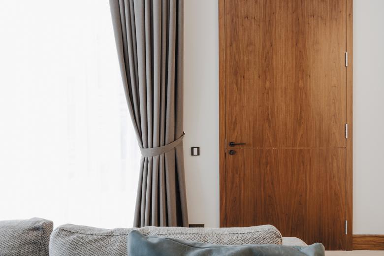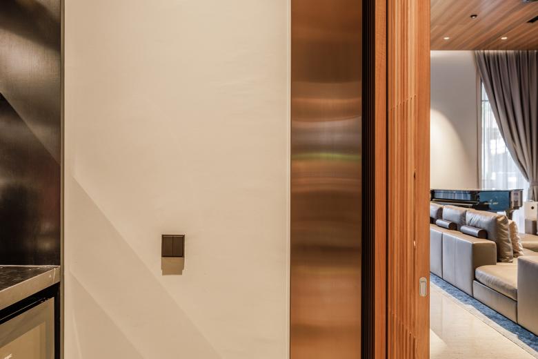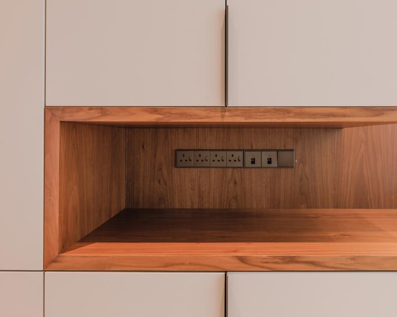 Für die Schalter und Bedienelemente fiel die Wahl auf die Serie LS 990 in Messing Antik. Das matte, leicht gebürstete Finish nimmt die warmen Metalltöne der Einrichtung auf. Die Oberfläche reagiert sanft auf das Licht und fügt sich unauffällig in die Wandflächen ein. Neben klassischen Schaltern wurden auch Steckdosen mit USB-Anschlüssen sowie KNX-F-50-Taster eingesetzt. Mit diesen können Licht- und Szenensteuerungen direkt am Bett oder Arbeitsplatz bedient werden.