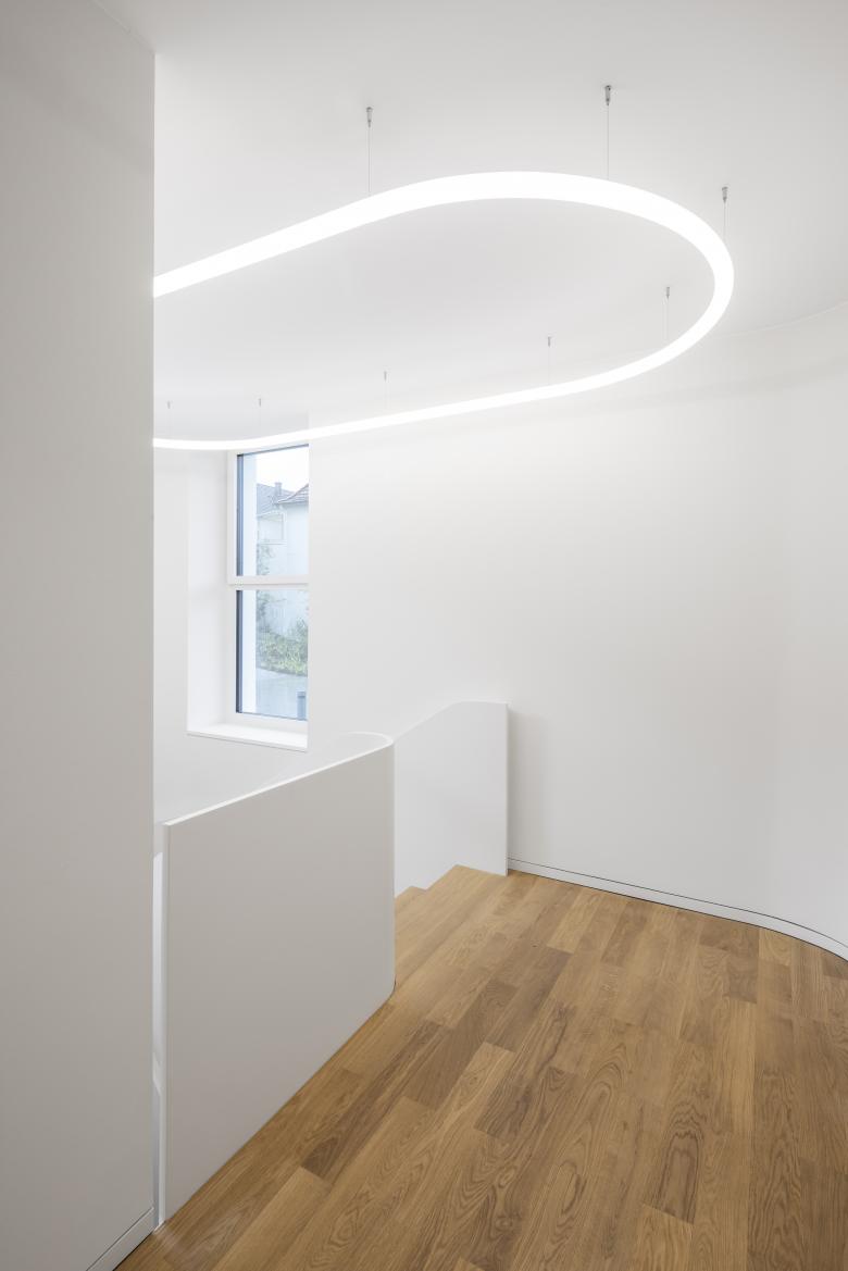 Zur „Schalterhalle“ führt eine gekrümmte Treppenskulptur aus lackiertem Stahl mit monolithischen Handläufen.