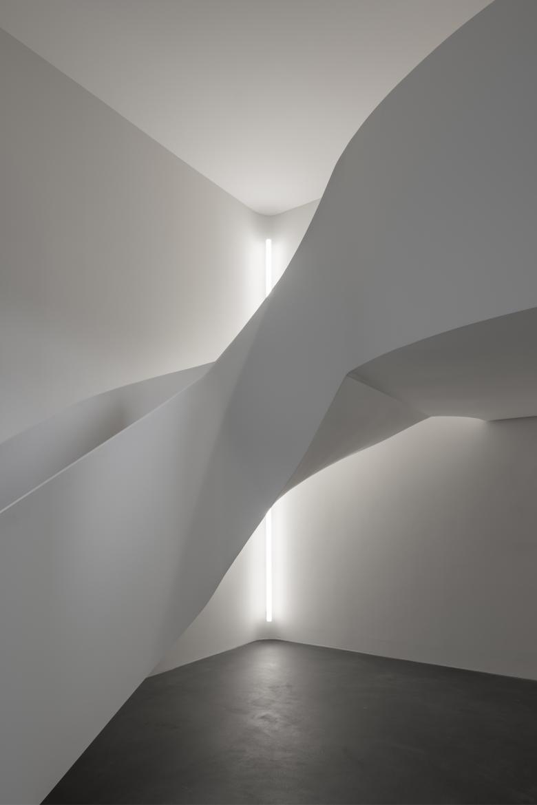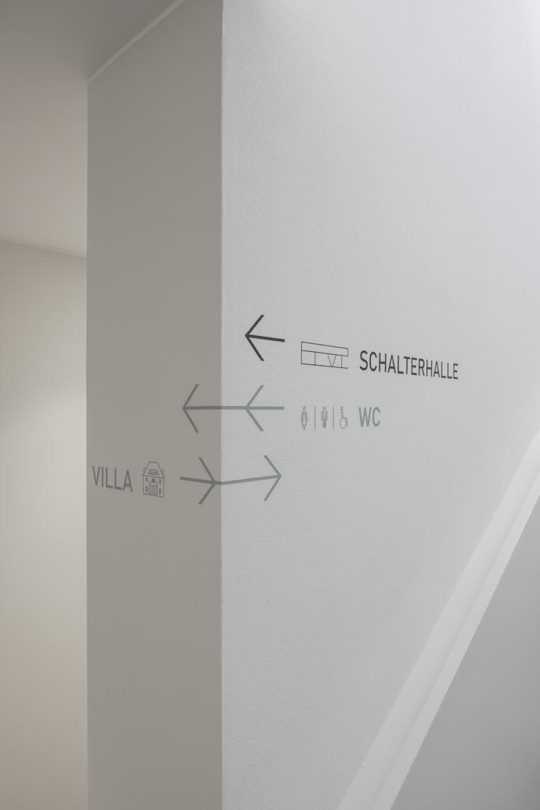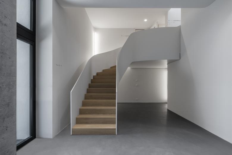 Zum Neubau, der „Schalterhalle“, gelangt man über eine skulpturale, mehrfach gekrümmte Treppenkonstruktion aus weiß lackiertem Stahl, die monolithisch Handläufe und Stufen in sich vereint.