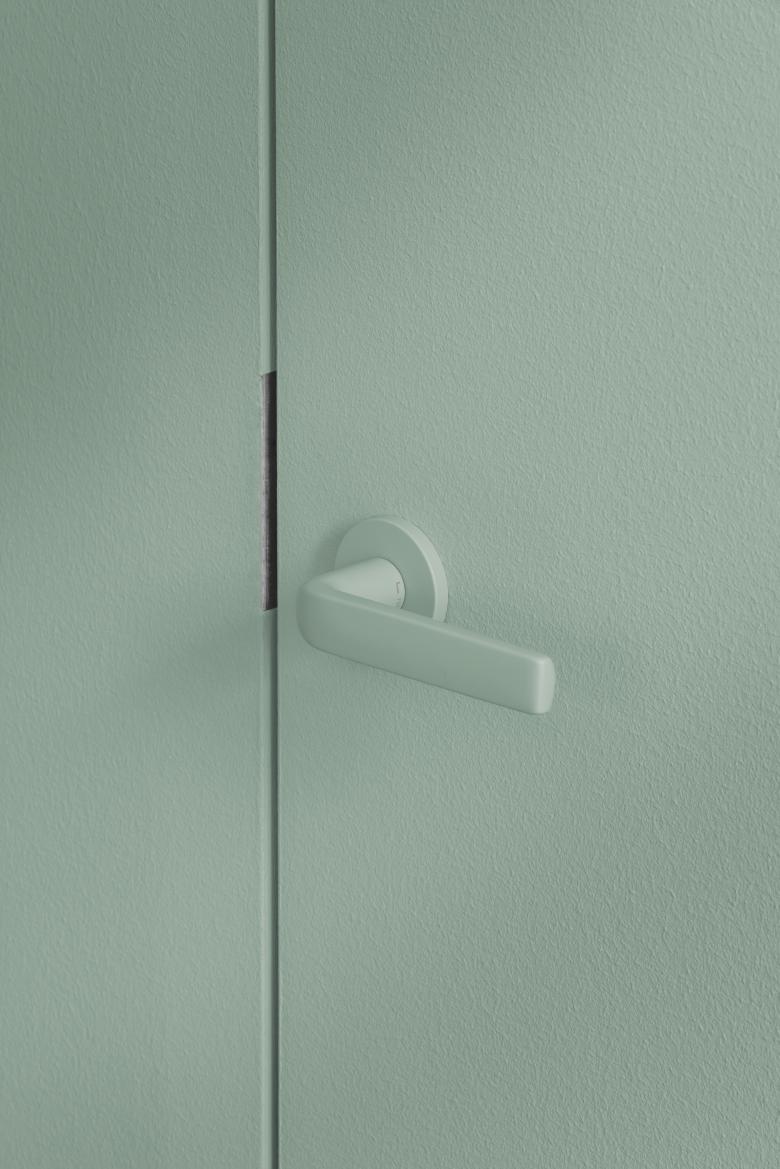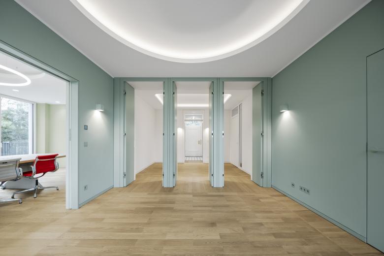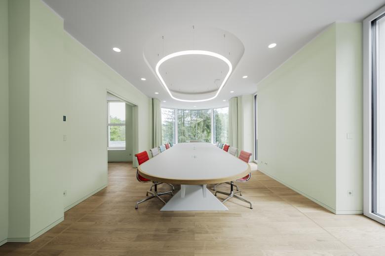 Wandfarben aus der Farbklaviatur Les Couleurs® Le Corbusier® verleihen den Räumen Frische und Heiterkeit. Im großen Besprechungsraum in der Farbe vert anglais pâle (32042) passen sich Konferenztisch und Deckenleuchte im Radius an das halbrunde Erkerfenster an.