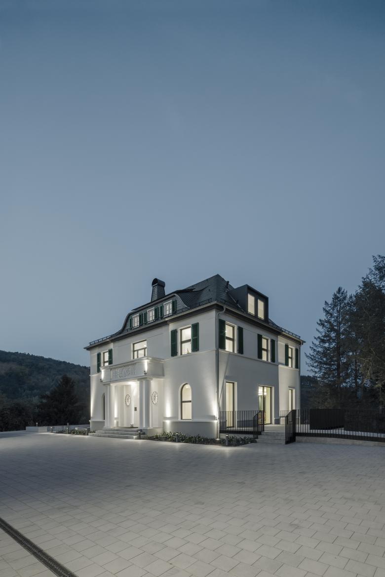 Klar gekennzeichnete Symbole markieren die Wegeführung und Lichtakzente begleiten den Übergang zwischen Villa und Neubau.