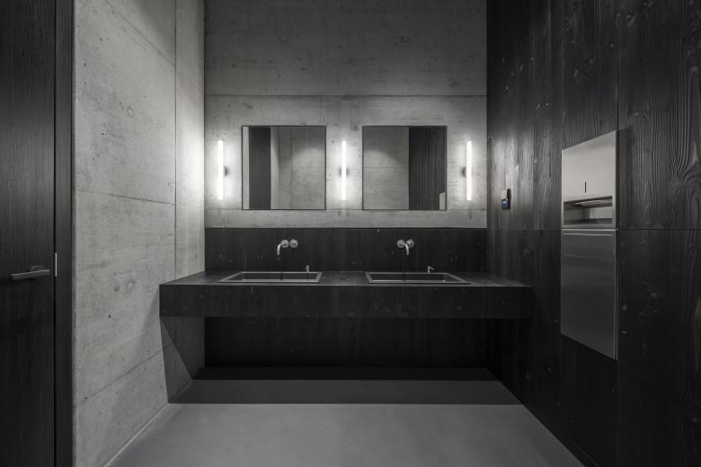 Im WC-Waschraum sowie im gesamten Neubau überwiegen klare Formen und dunkle Töne.