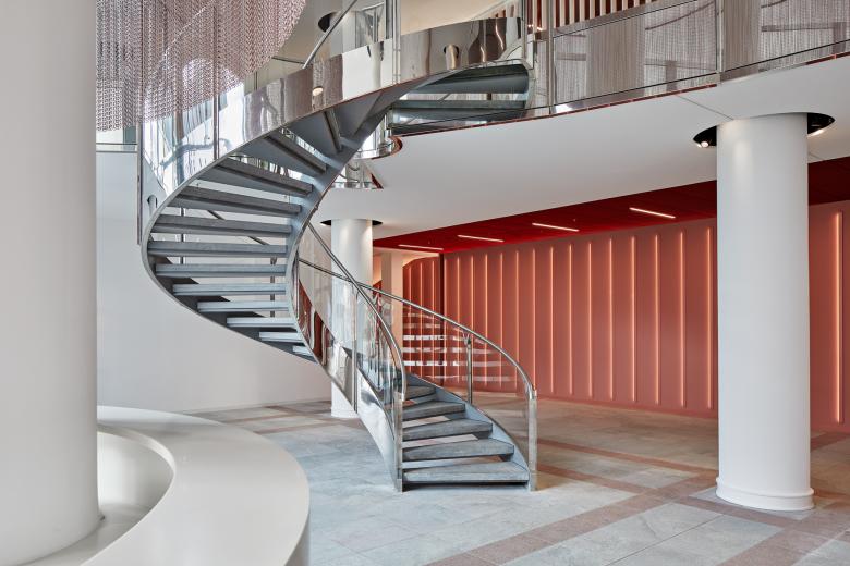 Der glänzende Bestandsboden wurde gestockt, um ihn so vollständig erhalten zu können. Der dadurch entstandene Rosé-Ton in matt fügt sich nun stimmig ins Gesamtkonzept ein und die neu geschaffenen Innenräume harmonieren mit der bestehenden Außenfassade. Wandverkleidungen, Streckmetalldecken, Sprinklerrosetten, Leuchtkörper, Sitzmöbel - alles wurde rosarot eingefärbt. Die monochrome Farbigkeit wirkt dabei präsent und doch hintergründig zurückhaltend.