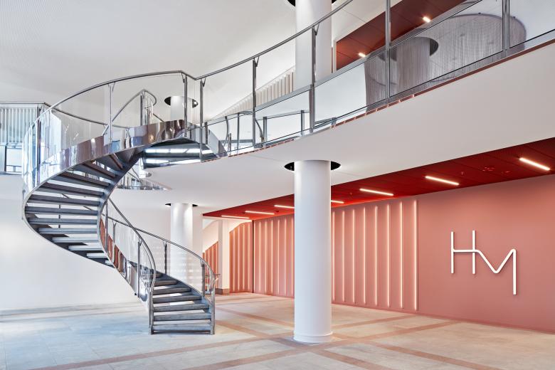 In dieser Atmosphäre bekommen unsere gestalterischen Elemente Ihren Auftritt: Der gebogene Catwalk mit einer übergroßen Videowall für dynamische Fashionshows leitet Besucher mit seiner geschwungenen Form ins Innere des Foyers. Das Lichtkonzept, das wir zusammen mit unserem Netzwerkpartner Lichtwerte speziell für die HdM entwickelt haben, setzt auf Rhythmus, Strukturierung und Orientierung. Lichtführung und Wegeleitsystem greifen hier eng ineinander. Für eine textile Anspielung sorgen unsere meterlangen gewobenen Vorhänge aus Aluminiumketten. Sie säumen den Catwalk als auch den prominenten runden Infopoint als Dreh- und Angelpunkt. Das Projekt wurde im laufenden Betrieb umgesetzt. Wir danken allen Beteiligten bei dieser logistischen Herausforderung.