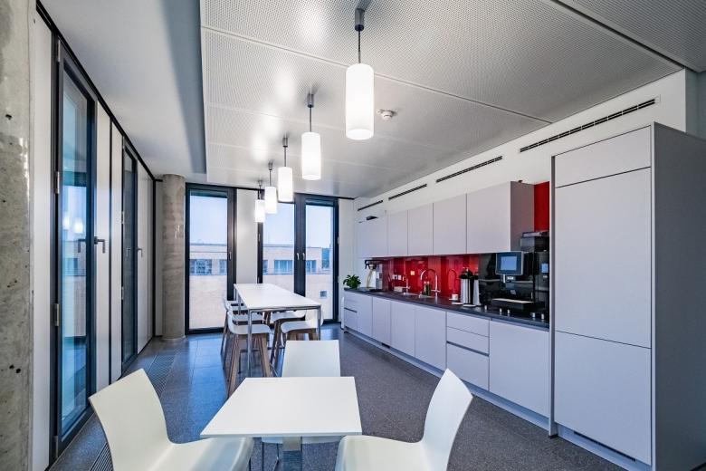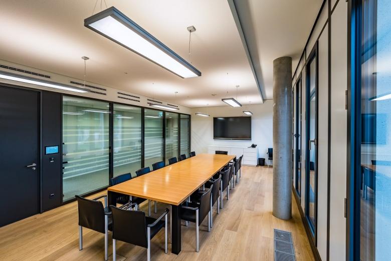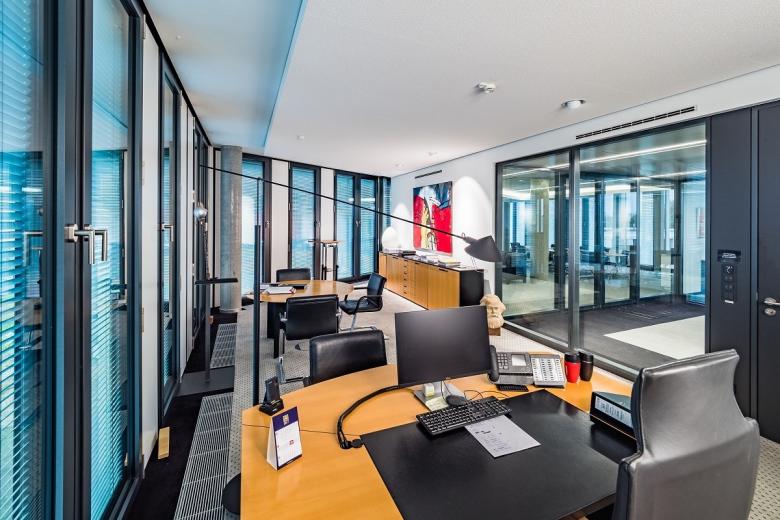 Die Fa. Kiefer wurde bereits in einem frühen Projektstadium zur Sicherstellung der Komfort- und Schallschutzforderungen aller Büro- und Besprechungsräume in die TGA-Planungen eingebunden. Für die Büroräume kamen optisch hochwertige Glas-Systemtrennwände zum Einsatz mit einer kompletten RLT-Installation Zuluft / Abluft incl. der Luftdurchlässe im Bereich des abgehängten Flurkoffers. Die Büros wurden als 3-Achsbüros a 1,35 m ausgebaut und bieten angenehm moderne und helle Arbeitsplätze für je 2 Mitarbeiter. Mit einer Luftmenge von ± 45 m³/h je Mitarbeiter wurde der Qualitätsansatz einer “Guten Raumluftqualität“ umgesetzt - dies entspricht einem ca. 2-fachen Luftwechsel.