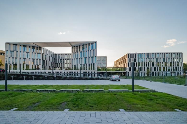 Das fünf- bzw. sechsstöckige Verwaltungsgebäude besteht aus drei Baukörpern, die über eine zweigeschossige Eingangshalle miteinander verbunden sind. Auf einer Bruttogrundfläche von 27.000 m² bietet es ausreichend Platz für Büroräume, Konferenzräume als auch für ein Mitarbeiter-Restaurant und eine Cafeteria. Die Architektur ist durchdacht - das Gebäude bietet durch die vertikale Erschließung der Eingangshalle mit großzügigen Treppen und Aufzügen und durch Verbindungsbrücken auf den Geschossen, eine schnelle Nutzung und Verteilung der Besucher und Mitarbeiter innerhalb des Gebäudes.