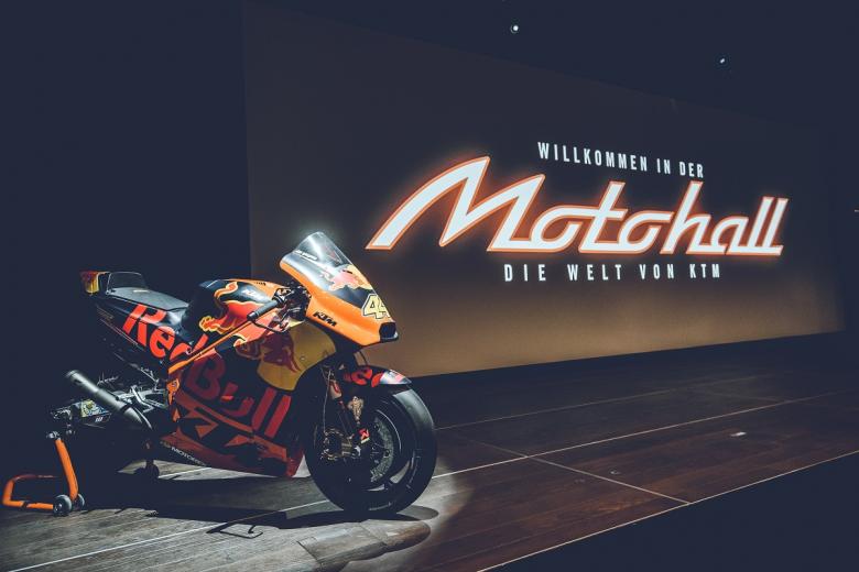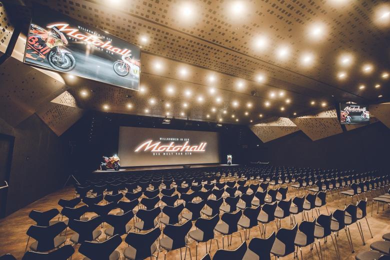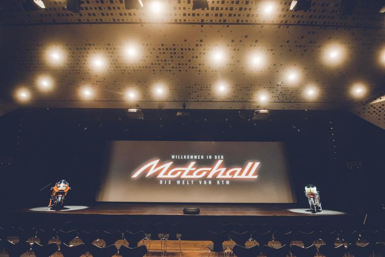Am östlichen Scheitelpunkt der äußersten Ellipse verfügt die KTM-Motohall über viereinhalb Geschoss-Ebenen, die oberirdischen zweieinhalb sind der Inszenierung der Marke KTM als Dauerausstellung vorbehalten. Mit interaktiven Displays, virtuellen Rundgängen und über einhundert Originalmaschinen werden Motorsporthelden, Firmengeschichte sowie Innovationen, Technologie und Technik rund um das Thema Motorrad präsentiert. Zwischen den tragenden Kernen eröffnen sich ganz unterschiedliche Räume – Lichtsituationen und Durchblicke sorgen für einen spannungsreichen Innenraum. Das Zusammenspiel der Materialien, eingesetzt wurden Sichtbeton, Aluminium und Terrazzo, harmoniert mit der stimmigen Ausstellungsarchitektur und lässt einen prägnanten Erlebnisraum entstehen. Grafik, Licht, Medien und inhaltliche Konzeption sprechen eine einheitliche Sprache: Wie ein orangefarbener Faden zieht sich das Leitthema – Fahrgefühl pur – in Formen, Farben und Materialien durch die einzelnen Ausstellungsstationen.