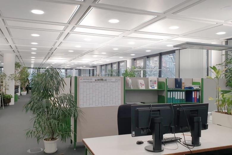 Eine besondere Herausforderung war die Sanierung der als Kassettendecke konzipierten Geschossdecken. „Zum Zeitpunkt der Errichtung des Gebäudes im Jahr 1973 wählte man im Bestandsgebäude ein Lichtbandsystem mit eingebauten Leuchten, die konzentrisch um beide Kerne laufen. Langfeldleuchten wurden asymmetrisch in der Kassette angeordnet, das Restfeld als Akustikdecke in Form textiler Spannstoffelemente ausgeführt. Die Leuchten waren zudem integraler Bestandteil des Lüftungssystems. Genau diese spezielle Ausbildung der Geschossdecken erforderte nun eine Sonderlösung bei der Sanierung“, erläutert Simon Mündler weiter.