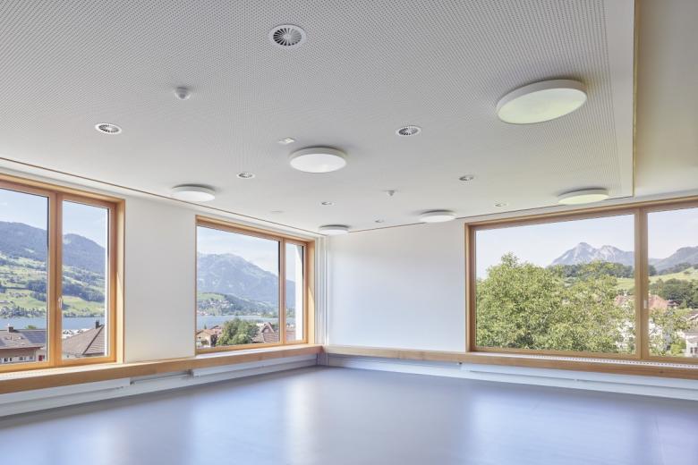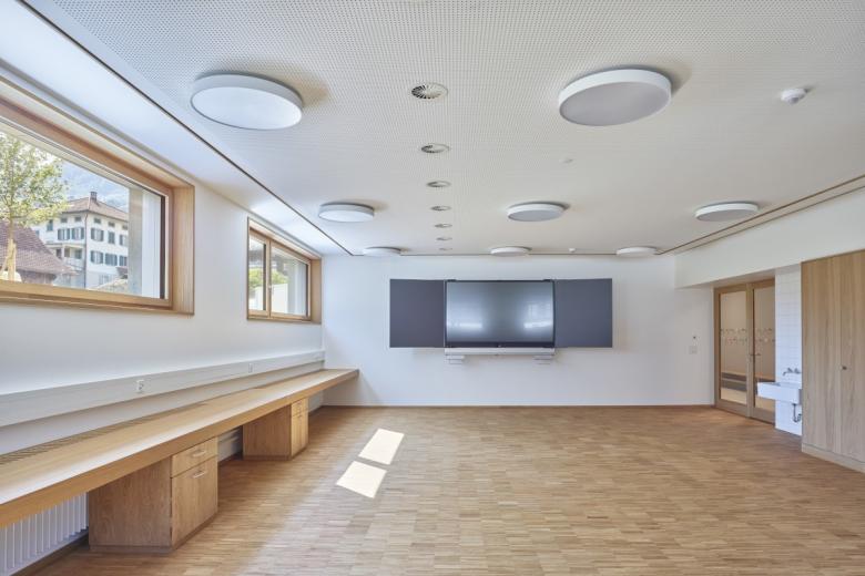 Das Türli-Gebäude ist vierstöckig mit einem niedrigen Walmdach und fügt sich daher ideal in das bestehende Ortsbild ein. Außen wirkt es kompakt, innen sorgt ein großer Lichtschacht im Dach für natürliches Licht und die überwiegend in hellem Holz gehaltene Ausstattung für einen offenen, freundlichen Empfang. 12 Klassenräume, vier Gruppenräume, Musikzimmer und Singsaal, Lehrerzimmer, Logopädiezimmer und Räume für Werken und Basteln sowie Nebenräume für Lager oder Gebäudetechnik finden Platz im neuen Schulhaus. Vor allem die Klassenräume in den beiden oberen Stockwerken mit ihren großzügigen Panoramafenstern samt umlaufender Fensterbank sind ein echtes Highlight für die Schüler: Sie bieten eine grandiose Aussicht auf den Sarnersee oder die Kirche und den Dorfplatz und lassen die Klassenzimmer hell und freundlich wirken.