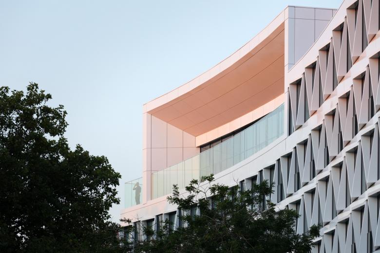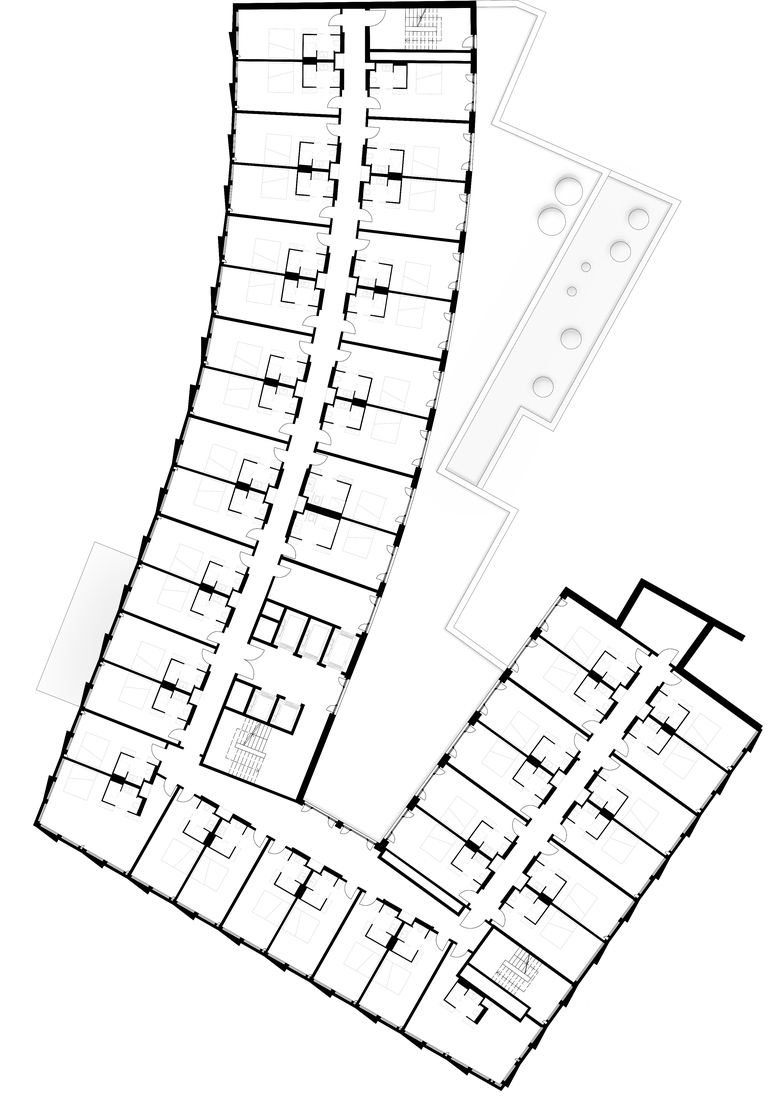 Optisches Highlight ist die charakteristische Fassade, deren Aussehen sich aus der schuppenartigen Anordnung der Zimmer ergibt. Bei dieser geschwungenen Fassade entsteht durch die spielerische Anordnung der Fensterelementen ein Spiel mit räumlicher Tiefe, die das Auge fasziniert und fesselt. Die spielerische Anordnung von vorgefertigten Fensterelementen unterliegt einer festen Regel: Das erste Fenster hat einen Rahmen, das zweite nicht und das dritte Element ist um 180 Grad gedreht.