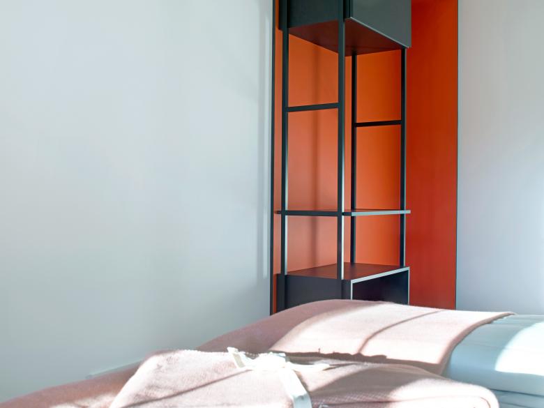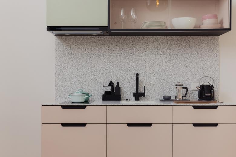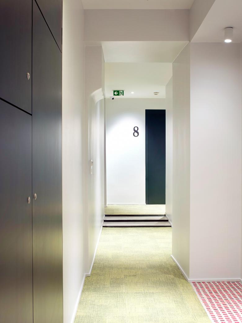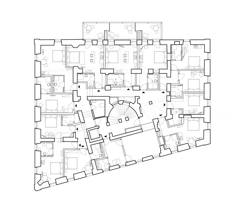 Die Gestaltung der zugehörigen Hotelzimmer – der Marktbar Studios - entspricht dem Entwurfskonzept der Marktbar und übersetzt dieses in eine privatere Situation. Die Studios sind zwar im Standard eines Boutique Hotels ausgestattet, bieten aber bewusst die Qualität einer Altbauwohnung.