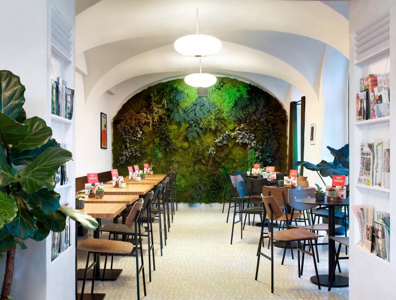 Die Grenzen zwischen Gast und Gastgeber lösen sich durch das niedere Barmöbel auf und das Lokal öffnet sich durch neue Portale zum Marktplatz und dem Gastgarten hin.