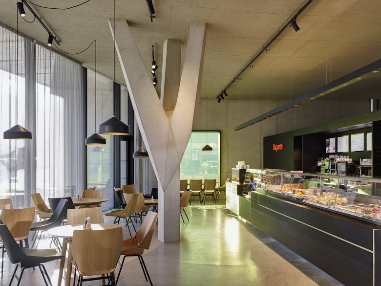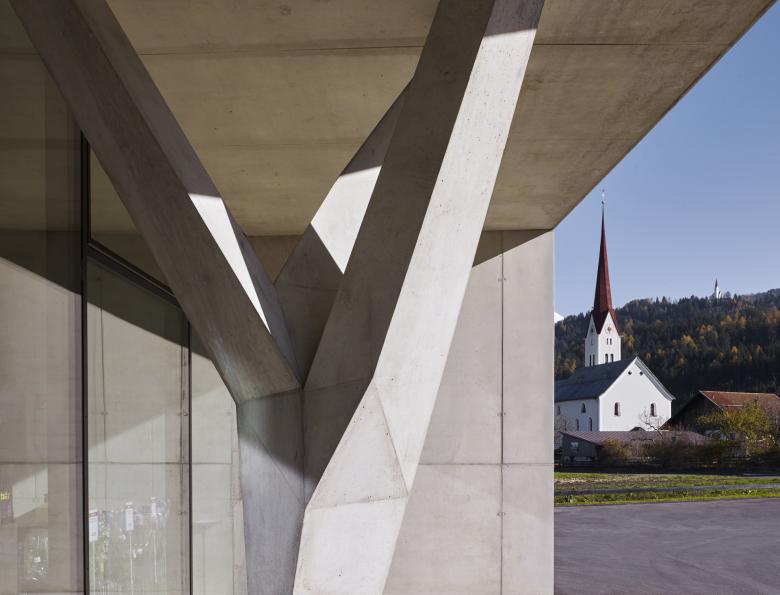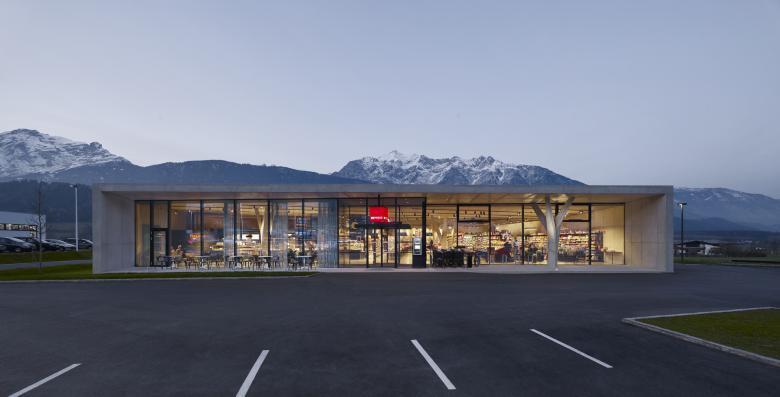 Ein verglaster Innenhof mit einem gepflanzten Baum holt die Natur direkt in den Markt hinein und steht im Kontrast zu den künstlichen Baumstützen aus Stahlbeton. Gezielte Ausblicke über der Feinkosttheke und durch ein Shedoberlicht fokussieren auf die Berggipfel und bilden den perfekten Rahmen für die Landschaft. Die große Glasfassade öffnet den Markt zum Parkplatz und zum Ort und lässt die Ware nach außen wirken. Die verwendeten Materialien sind auf das Wesentliche reduziert. Im Markt dominiert Sichtbeton in einem warmen Farbton, die Betondecke hat eine samtig strukturierte Oberfläche. Die Ware steht im Vordergrund.