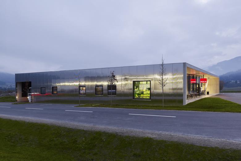 Das Gebäude befindet sich an der Landestraße am Ortsrand in Weer in unmittelbarer Nähe der Pfarrkirche. Die transparente Hauptfassade des monolithischen Gebäudes ist in Richtung Landesstraße orientiert, die anderen Gebäudeseiten werden von Grün umspült. Eine Metallfassade aus polierten Edelstahlpaneelen reflektiert die natürliche Umgebung je nach Wetter, Jahreszeit und Tageslicht in unterschiedlichen Stimmungen. Sichtbetonflächen des Innenraums treten an der Südfassade nach außen und werden dort als umlaufender Stahlbetonrahmen sichtbar.