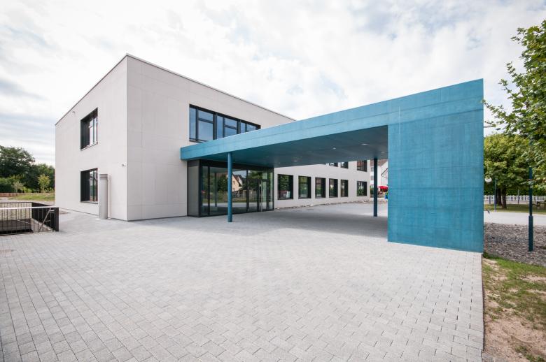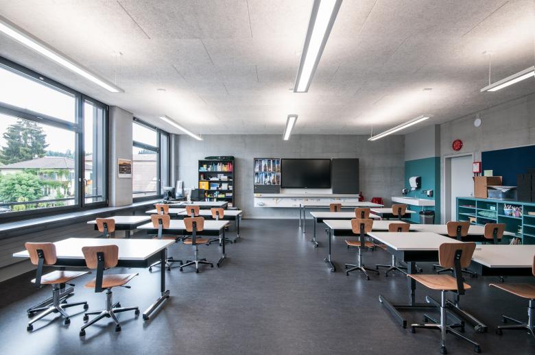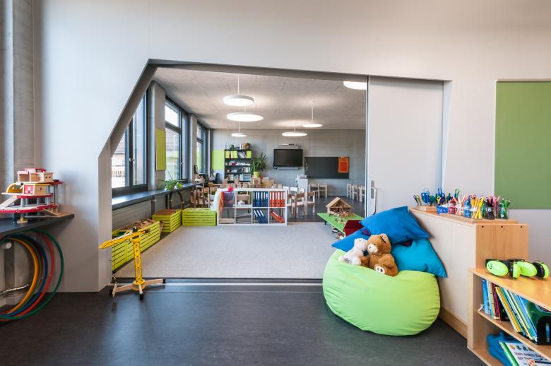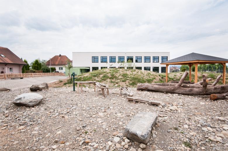 Der Neubau des Schulhauses Hueb in der Gemeinde Holziken ist als multifunktionaler Schulraum konzipiert und beinhaltet neben drei Kindergartenabteilungen auch drei Klassenzimmer, mit den dazugehörigen Gruppen- und Nebenräumen. Im selektiven Präqualifikations- verfahren mit Variantenstudien überzeugte die raumplanerisch sinnvolle Eingabe als Ersatzneubau am Meisten. Neben dem Vorteil des bestehenden Untergeschosses entstand im Erdgeschoss eine grosse Freifläche als zusammenhängender Spielplatz. Der Neubau ist als schlichter und daher wirtschaftlicher Kubus umgesetzt worden. Beim architektonischen Konzept wurde der deutlichen Trennung von Kindergarten- und Schülerbereich grossen Wert beigemessen.