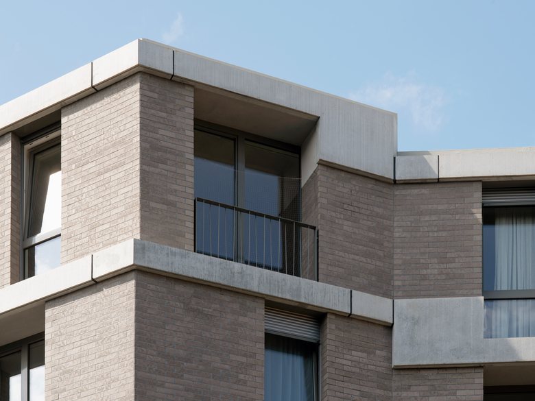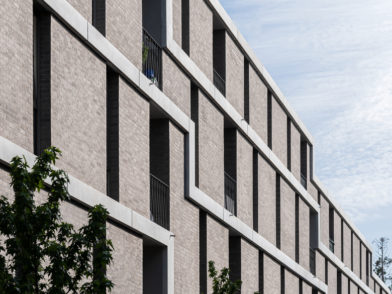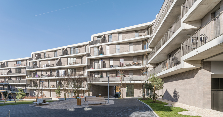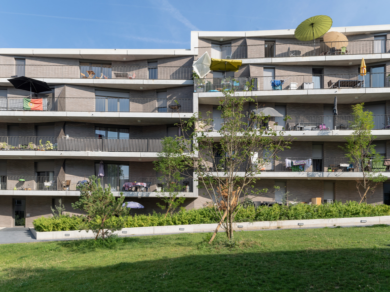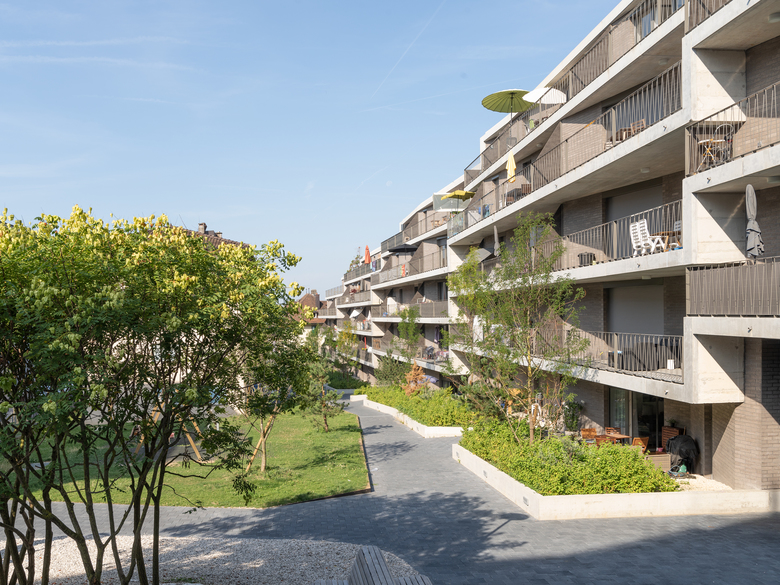 Sur la rue, le front urbain s’affirme par sa géométrie rigoureuse et sa minéralité tandis qu’à l’intérieur de la cour, les balcons filants et la végétation offrent aux habitants un espace de vie communautaire et de détente. Au rez-de-chaussée des immeubles, trois vastes passages piétons connectent l’intérieur et l’extérieur de l’îlot.