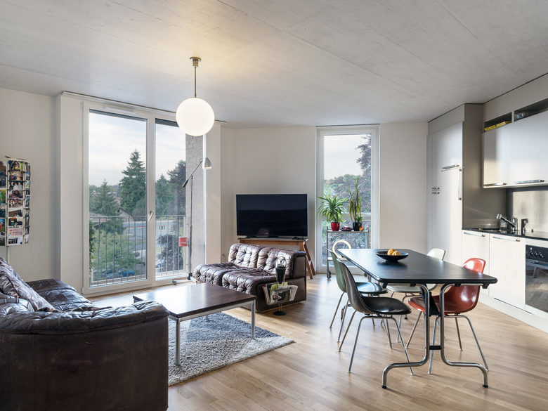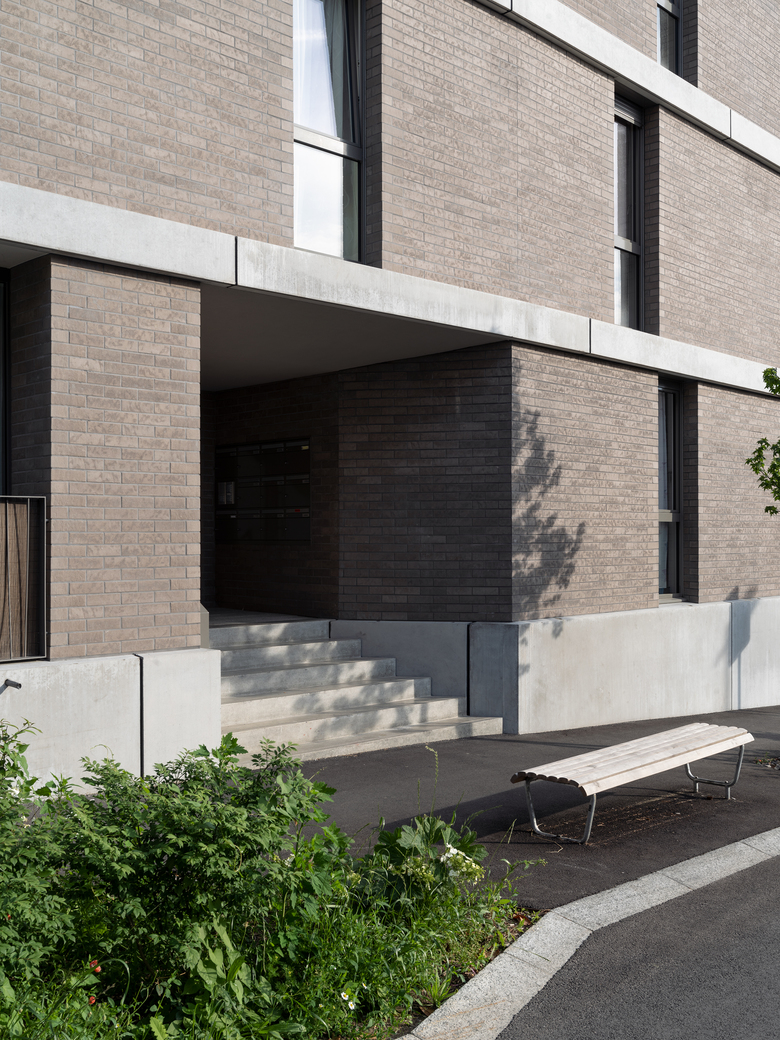 La structure parcellaire définit l’implantation du volume construit. Un long bâtiment étroit qui se divise en sept unités articulées autour des cages d’escalier indépendantes. Les appartements de 2 à 5 pièces sont majoritairement traversants entre la rue et la cour et se prolongent sur une surface de balcon généreuse orientée au sud. Le caractère des espaces de vie est amenée par l’expression des matériaux bruts qui les composent : sols en bois, plafonds en béton apparent, briques des balcons et des terrasses.