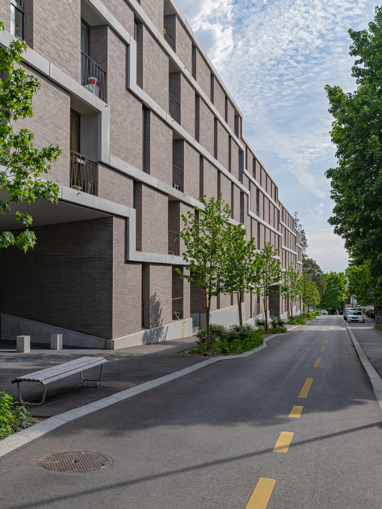 La topographie du quartier s’exprime dans la structure du bâtiment. Les décrochements successifs des dalles en béton préfabriqué accompagnent la pente naturelle de la rue. Le remplissage des façades en briques fait référence au passé industriel de Renens et donne au bâtiment un aspect minéral en contraste avec la verdure des aménagements extérieurs.