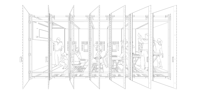 为了空间建造尽量不影响现有办公,而且满足发展不利可空间还原的诉求。最好的办法就是结构可以自稳定,不需要与外界安装固定,避免现场装修。这样可随时移动或挪走,也满足于在工厂完全加工好,搬运到现场放置好、接电即可使用。