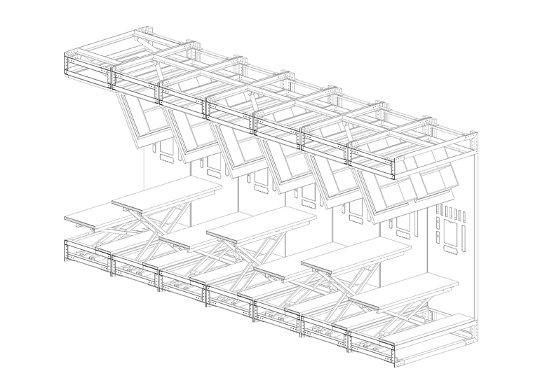 金属结构在外,木围护在内的,外界面采用玻璃,透明开敞。剖面形成C形的空间形态,具有完整的、温暖的内部空间品质。材料元素之间的关系清晰,对于预制、安装、搬运都很便利,具备不错的产品特质。