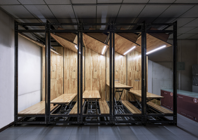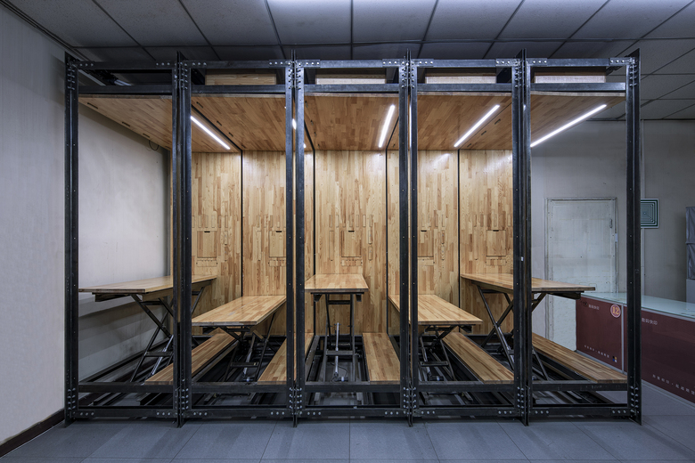 常规建筑状态一般要有外表皮将结构围护起来,这个微型建构选择将结构体外置。桌台功能体围合于内,保证了内外界面的连续性,外部结构体直接裸露也有效的避免包裹,节省不必要的制作费用,同时达到结实耐用、方便检修、便于清理。