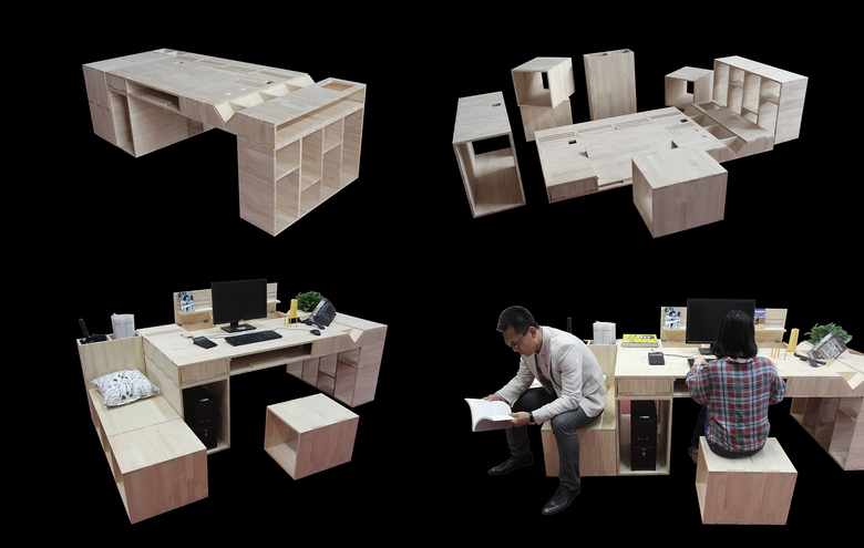 尽可能在单一空间内进行多重功能的空间可转化,让有限的空间得到无限的使用可能:办公、会议、讲演、展示..。可变的构造技术采用“X”变形原理和液压杆的结合,下部桌面、坐面可完全升起、收平,极限可升高1.2m,平可为地、低可为坐、高可为桌,上部柜体可伸缩开合,可收纳办公用品。模块与模块之间可无缝连接,前后平台升降配合,可以进行“桌”、“凳”的转换,高低有序排列可变成小型阶梯会议。